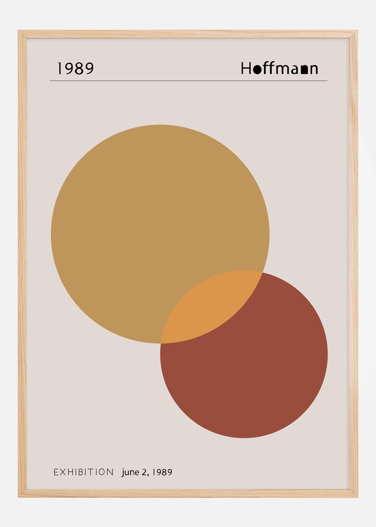 Ten minimalistyczny i wyrafinowany plakat oddaje hołd wystawie abstrakcyjnego artysty Hoffmanna z 1989 roku. Stylowy design z nakładającymi się kołami w ciepłych odcieniach brązu i ochry tworzy poczucie zarówno retro, jak i nowoczesności. Tekst jest dyskretnie umieszczony, aby uwydatnić elementy wizualne, gdzie każdy detal jest starannie zrównoważony, aby stworzyć nastrojowe i przyciągające dzieło sztuki.