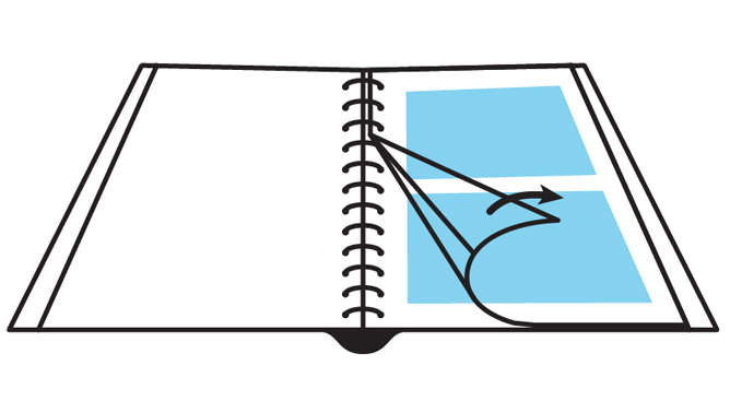 Podnieś folię ochronną, umieść swoje zdjęcia i z powrotem nałóż przezroczystą folię ochronną – i gotowe, prościej się nie da! Idealne rozwiązanie, gdy masz zdjęcia w różnych rozmiarach, a także wycinki z gazet czy inne materiały, których nie chcesz przyklejać na stałe. Wadą jest to, że nie możesz pisać na stronach, jak w większości innych typów albumów.