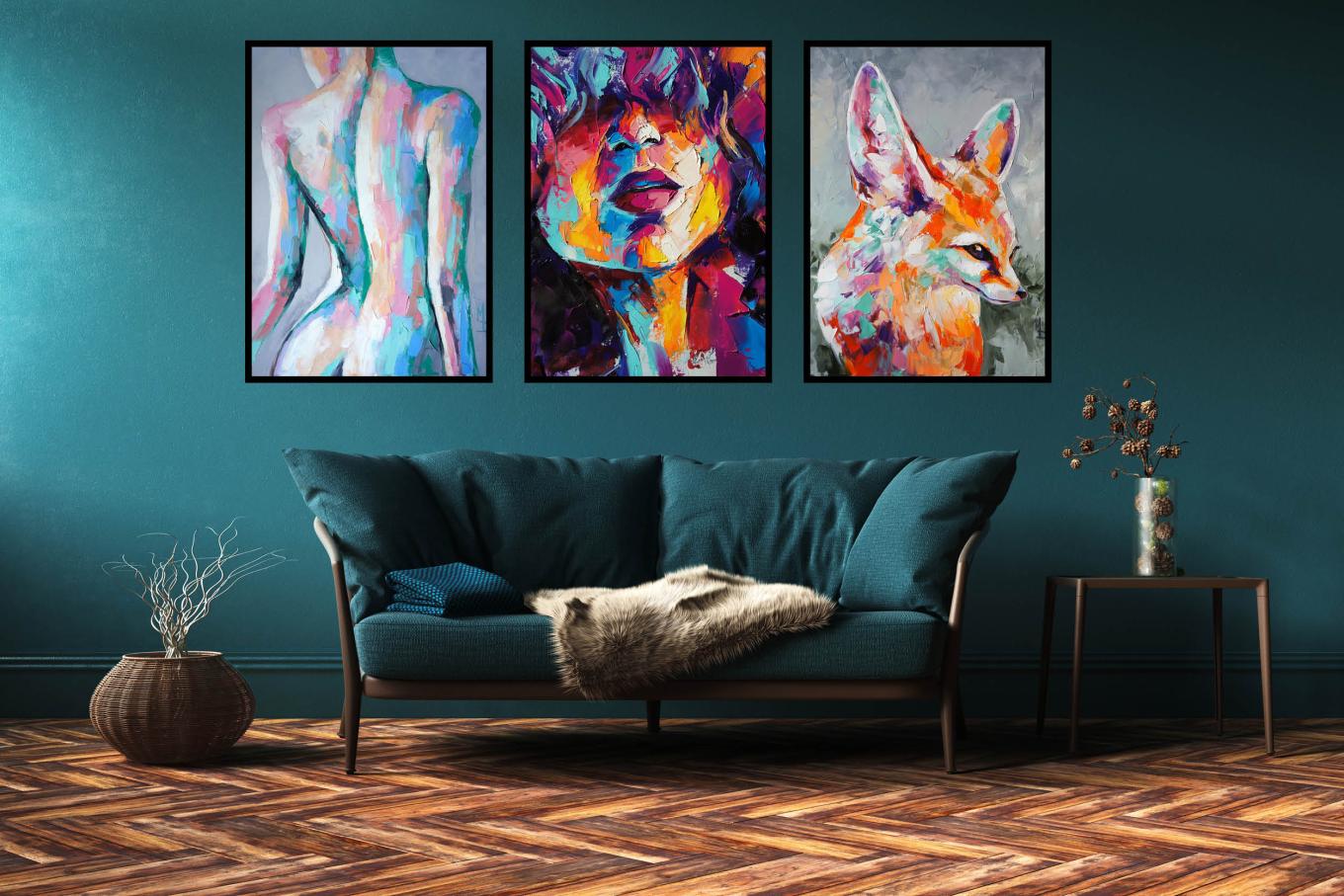 Tego typu ściana z obrazami świetnie prezentuje się zawieszona centralnie nad kanapą, łóżkiem, komodą lub innym meblem.
