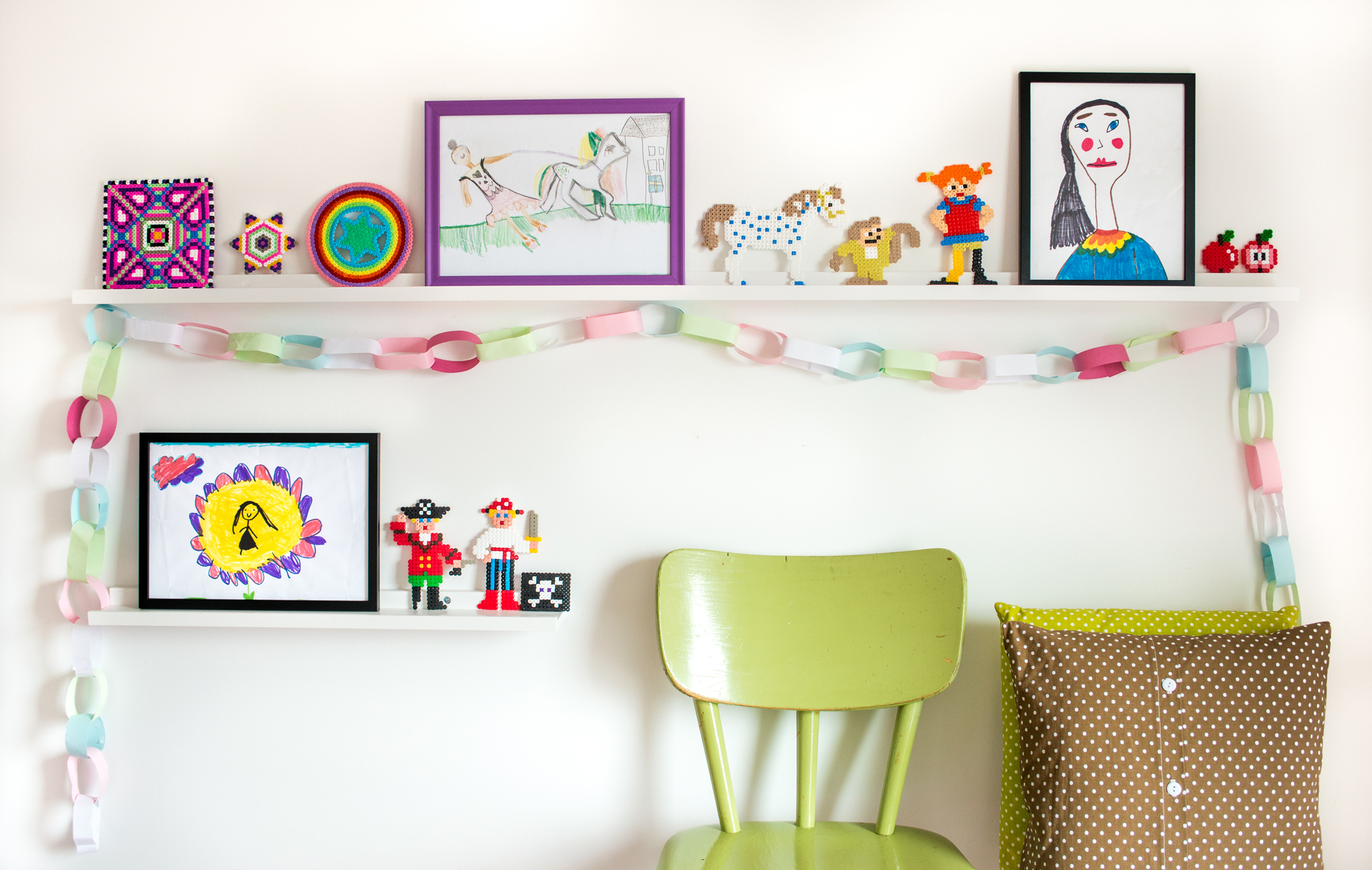Na zdjęciu użyliśmy koralików i girlandy – coś, co bardzo dobrze pasuje do pokoju dziecięcego, gdzie może być trochę dziecinne i zabawne. Jeśli masz półkę na obrazy w swojej sypialni lub salonie, prawdopodobnie chcesz zachować nieco bardziej surowy styl dekoracji.