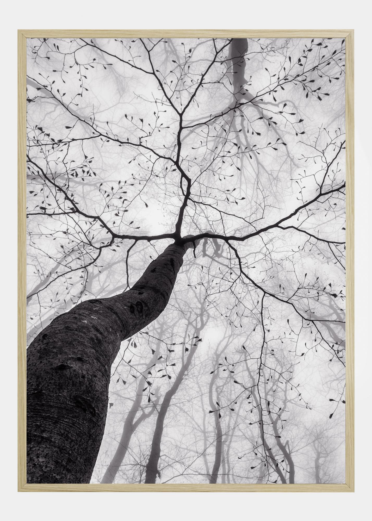 Plakat przyrodniczy z pniem drzewa, który wyciąga się ku niebu. Niech wzrok podąża wzdłuż pnia do gałęzi rozciągających się ku niebu. Drzewa z delikatnym rozmyciem wypełniają tło swoimi liśćmi. Ten czarno-biały obraz to doskonały dodatek na Twoją ścianę, który pozwala poczuć spokój natury.