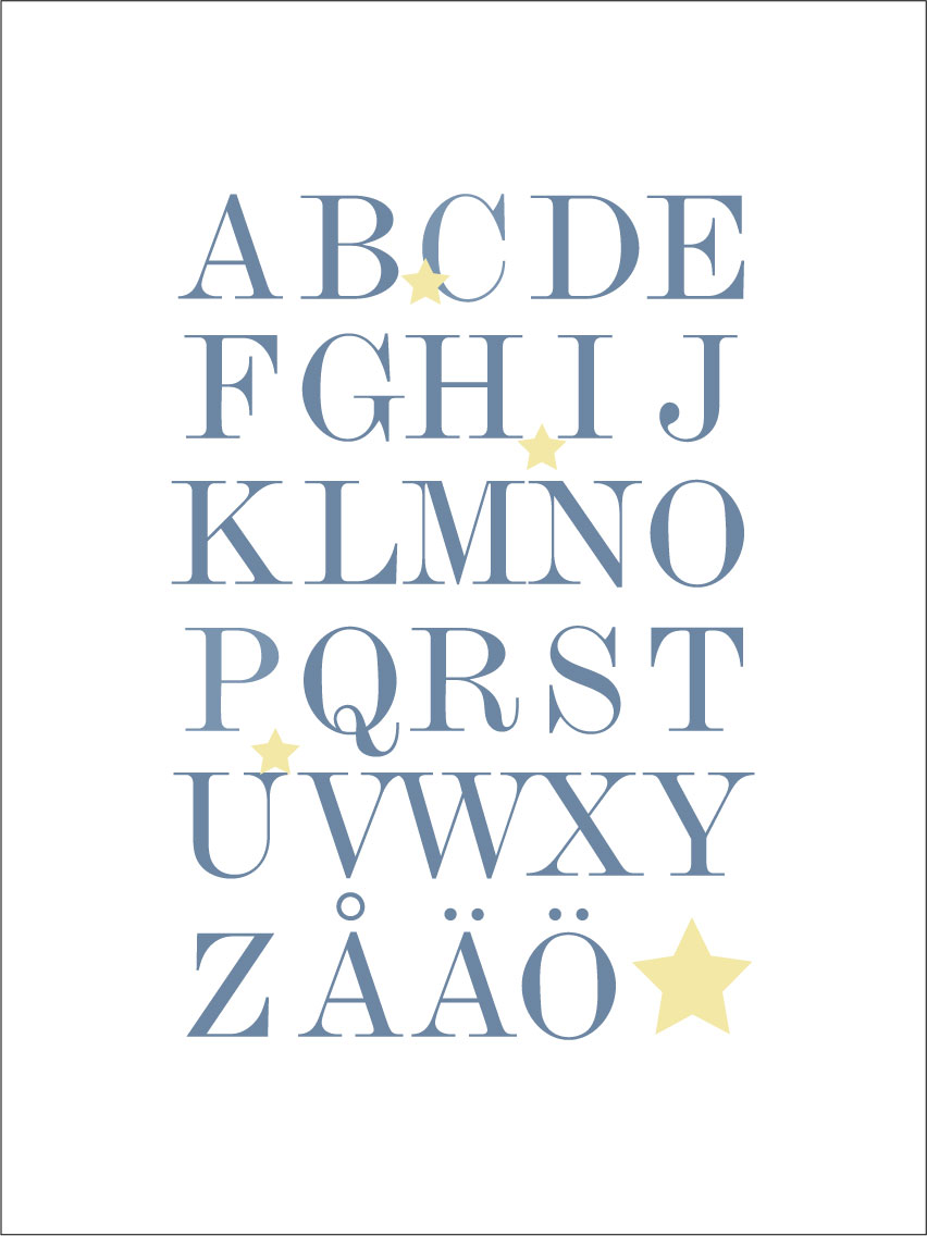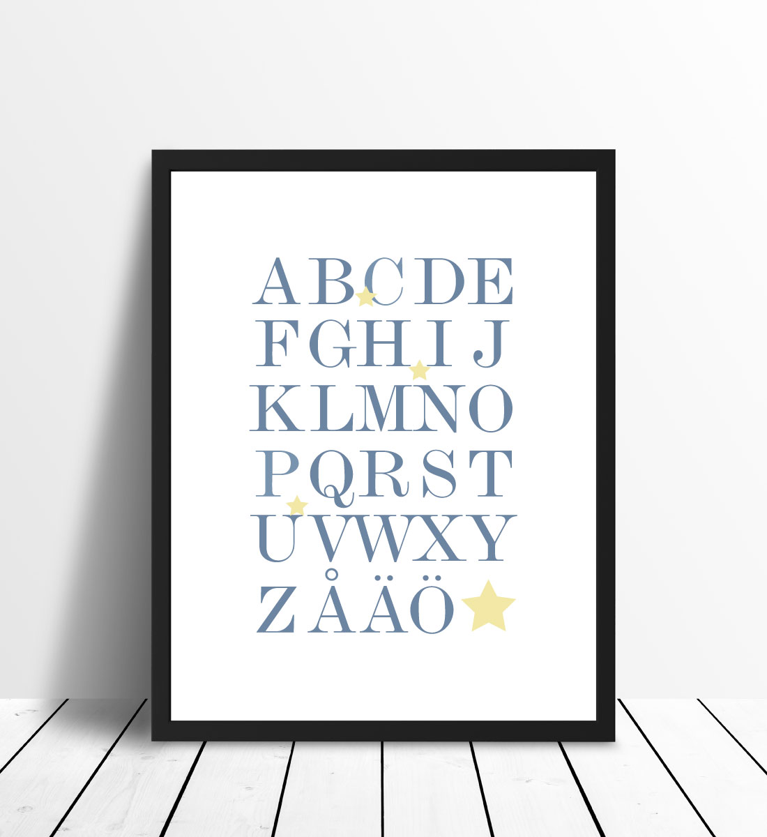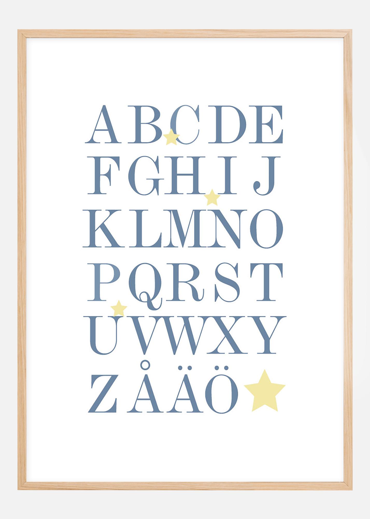 Plakat z całym alfabetem, A-Ö, w kolorze niebieskim i gwiazdkami w kolorze beżowym. Edukacyjny motyw doskonale sprawdzi się w pokoju dziecięcym do nauki alfabetu, ale także na innych ścianach w domu. Elegancki wygląd sprawia, że plakat pasuje do wszystkich stylów wnętrz i typów domów. Można go połączyć z innymi obrazami na ścianie w galerii z motywem tematycznym lub udekorować ścianę razem z plakatem z cyframi 1-10.