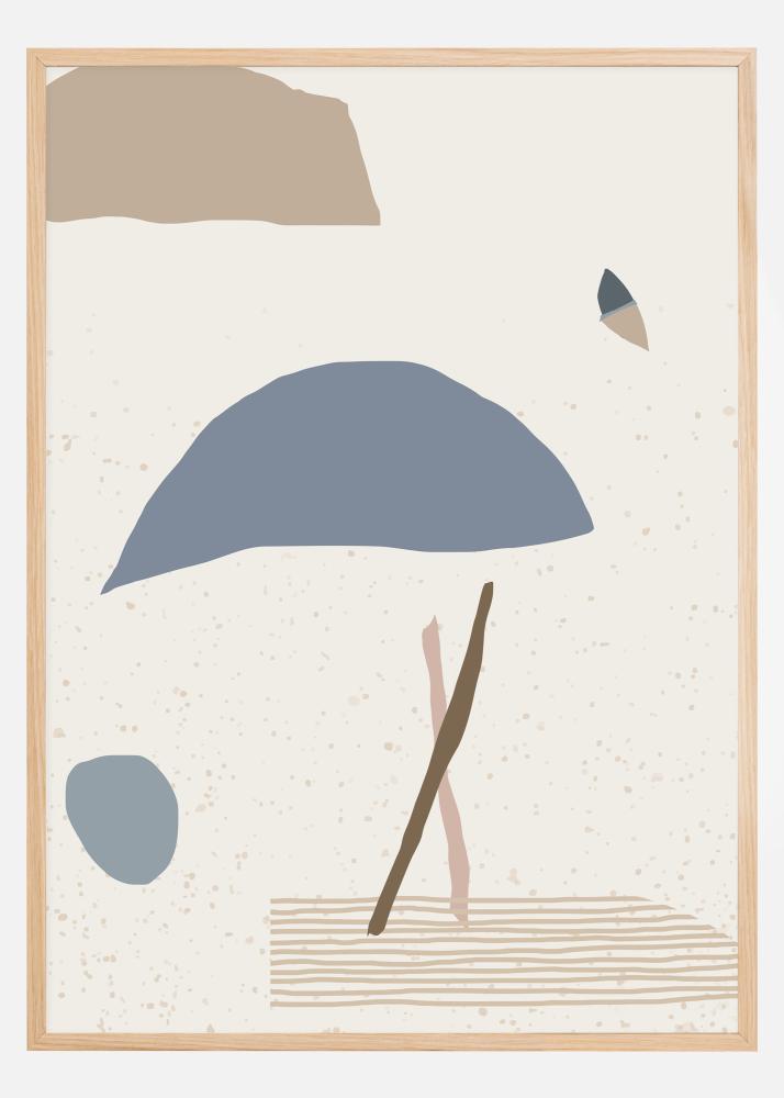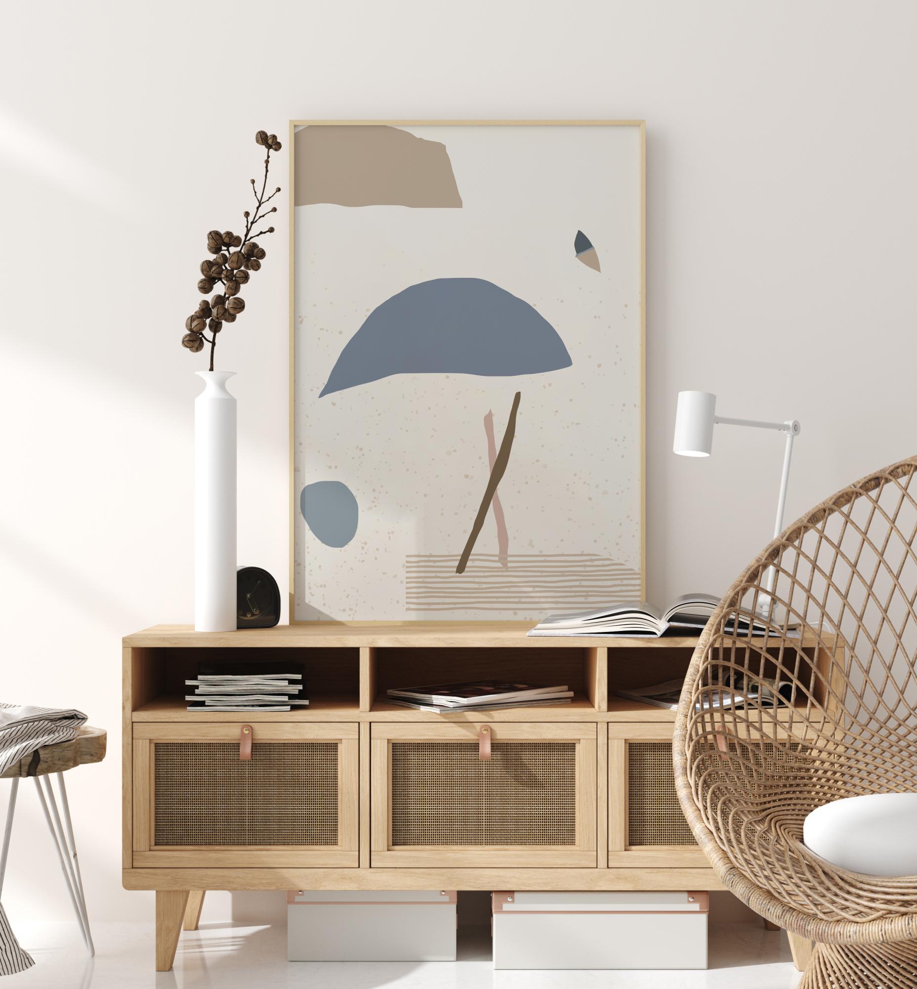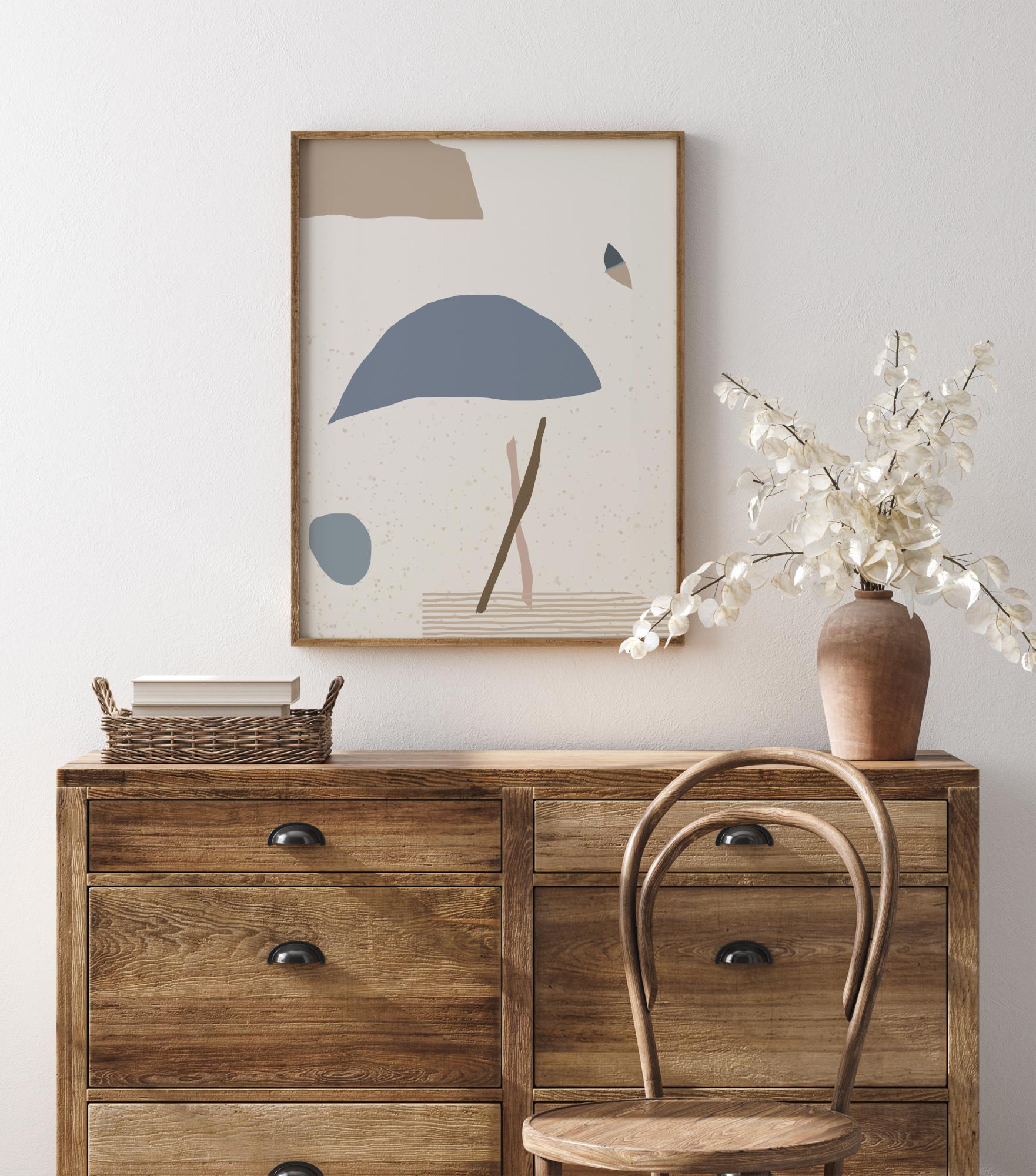 Abstrakcyjny plakat z niebieskimi, brązowymi i szarymi kształtami na białym tle. Zobacz, co chcesz zobaczyć w tym minimalistycznym dziele, które daje poczucie osoby, parasola, piłki, motyla lub chmury. Wprowadź galerię do swojego domu z tym kontemplacyjnym plakatem i zachęcaj do dyskusji na temat jego znaczenia.