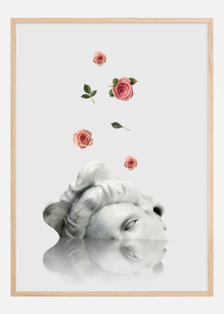 Ten artystyczny plakat przedstawia oniryczną kompozycję, w której rzeźba twarzy, wydająca się tonąć lub rozpuszczać, otoczona jest wirującymi różami w różnych fazach kwitnienia i listowiem. To fascynujący obraz, który łączy piękno kamienia i flory, oferując poczucie zarówno ponadczasowości, jak i ulotności.