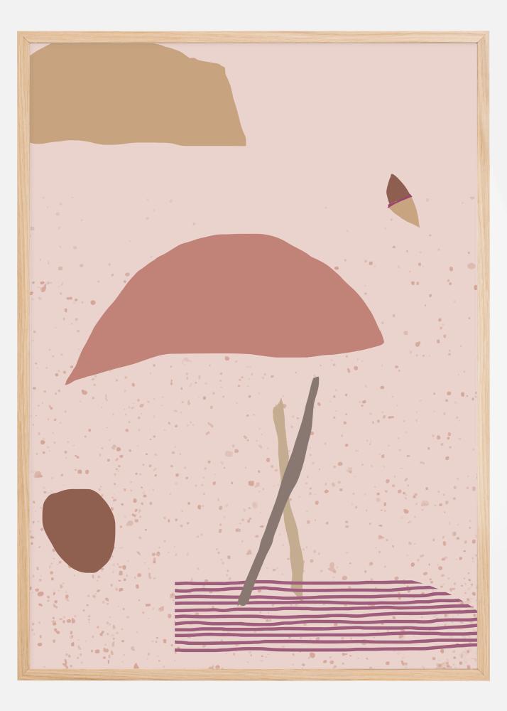 Abstrakcyjny plakat z czerwonymi, beżowymi, różowymi i fioletowymi kształtami na delikatnym nakrapianym tle. Ciesz się kojącym efektem kształtów i zastanów się, co oznacza, gdy widzisz kulę, kształt chmury, patyki, dywan lub parasol w dziele. Delikatne odcienie są idealne na przykład na ścianę łazienki.