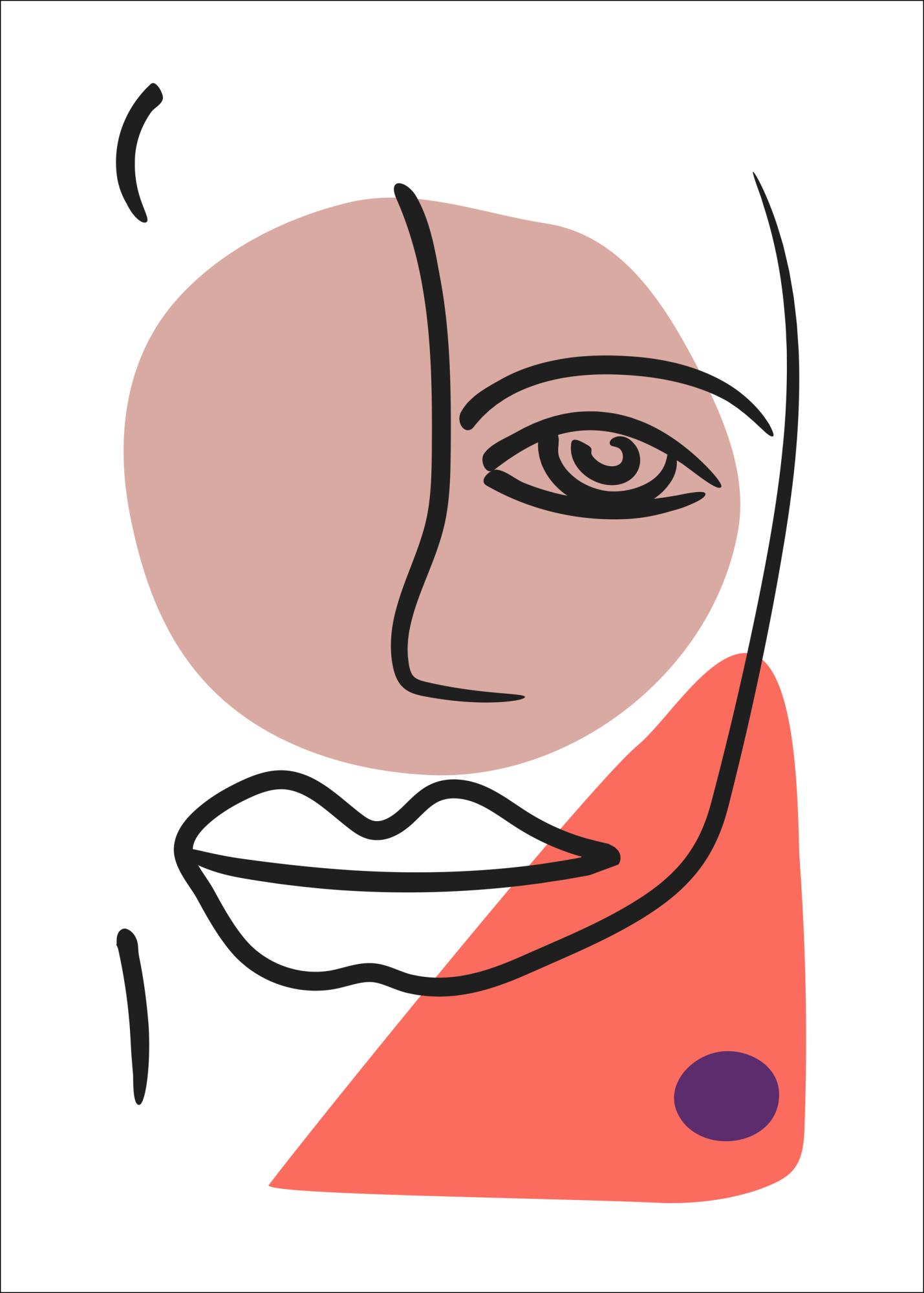 Abstrakcyjny plakat przedstawiający twarz z okiem, nosem i pełnymi ustami. Czarne linie twarzy umieszczone są na różowym kole i brzoskwiniowym trójkącie, co tworzy dramatyczny efekt. Uchwyć emocje i inspiruj się każdego dnia dzięki temu unikalnemu plakatowi, który pobudza wyobraźnię do życia.