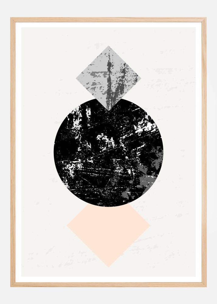Geometryczny abstrakcyjny plakat z dwoma kwadratami otaczającymi koło. Czarny krąg ma białą marmurację i jest flankowany przez niebieski marmurkowy kwadrat oraz różowy kwadrat. Każde miejsce znajduje się w punkcie, który skupia wzrok na uformowanym z ziemi kole w środku. Dodaj dramatyzmu prostej ścianie dzięki temu efektownemu dziełu sztuki.