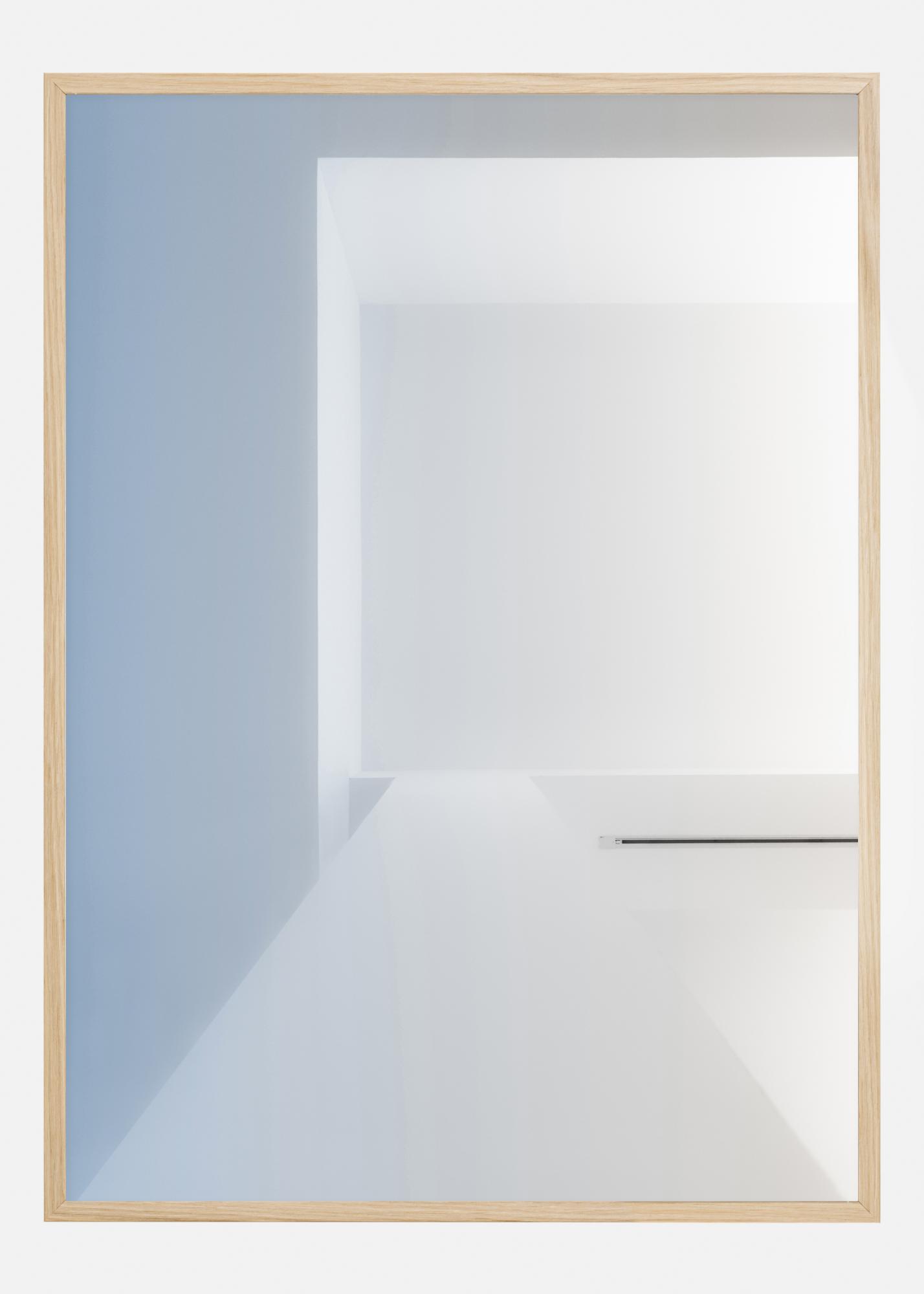 Abstrakcyjny plakat do dekoracji wnętrz w kojących odcieniach niebieskiego i białego. Główne tło jest miękko niebieskie z białym kwadratem przypominającym okno i blat. Wybuch miękko oślepiającej bieli po prawej stronie sprawia wrażenie, jakby słońce przebijało się przez odrobinę spokoju w Twoim domu.