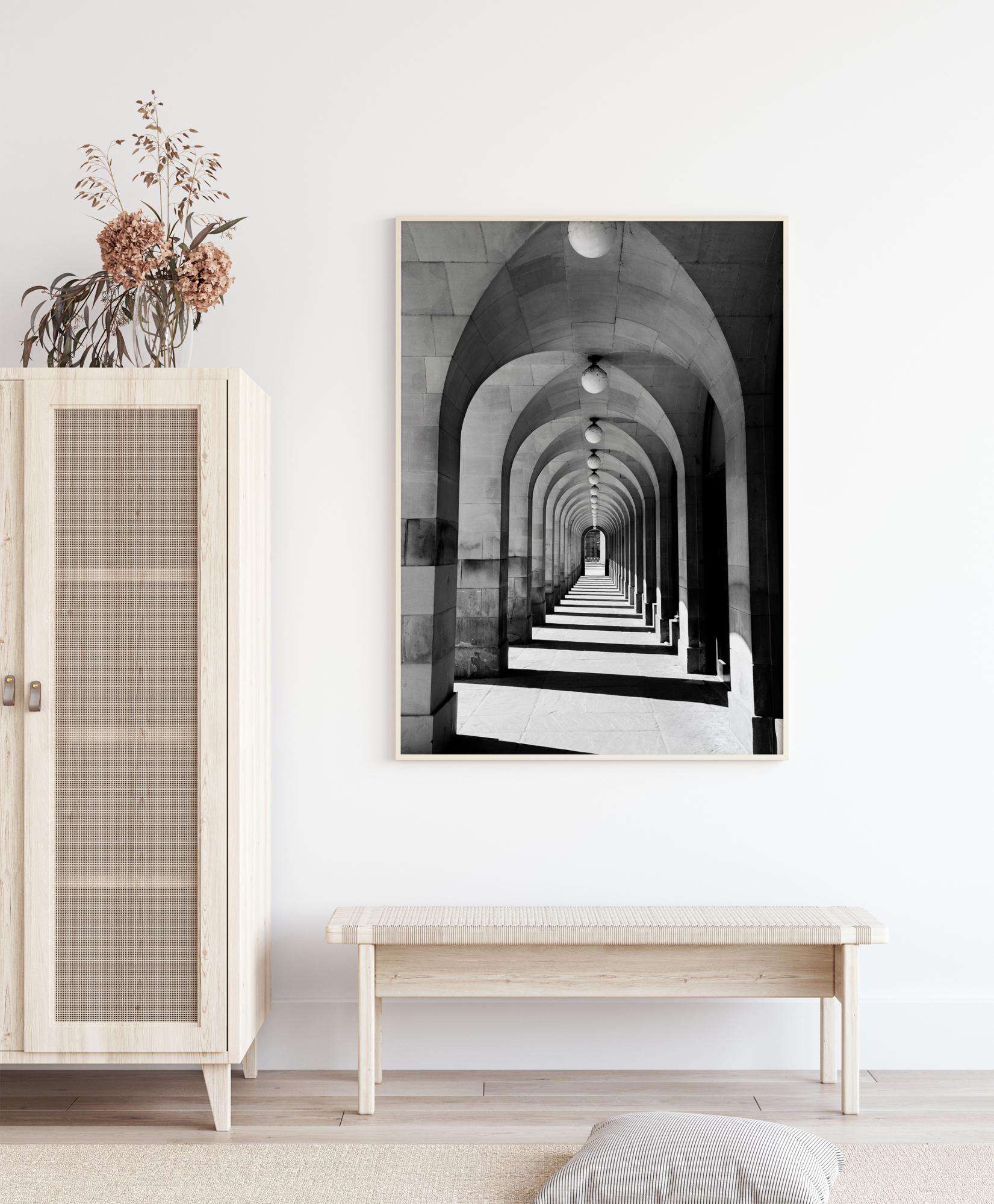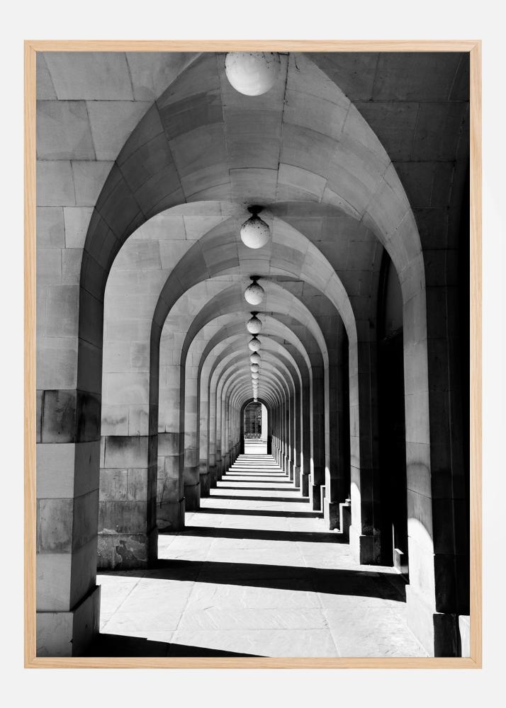 Plakat wnętrzarski przedstawiający długi korytarz z łukami. Każdy z łuków prowadzi wzrok w dół korytarza, gdy znika on w oddali. Szare odcienie sprawiają, że cienie na każdym łuku stają się widoczne w świetle. Poczuj, jak pokój staje się większy, gdy zawiesisz go i podążasz wzrokiem za korytarzem.