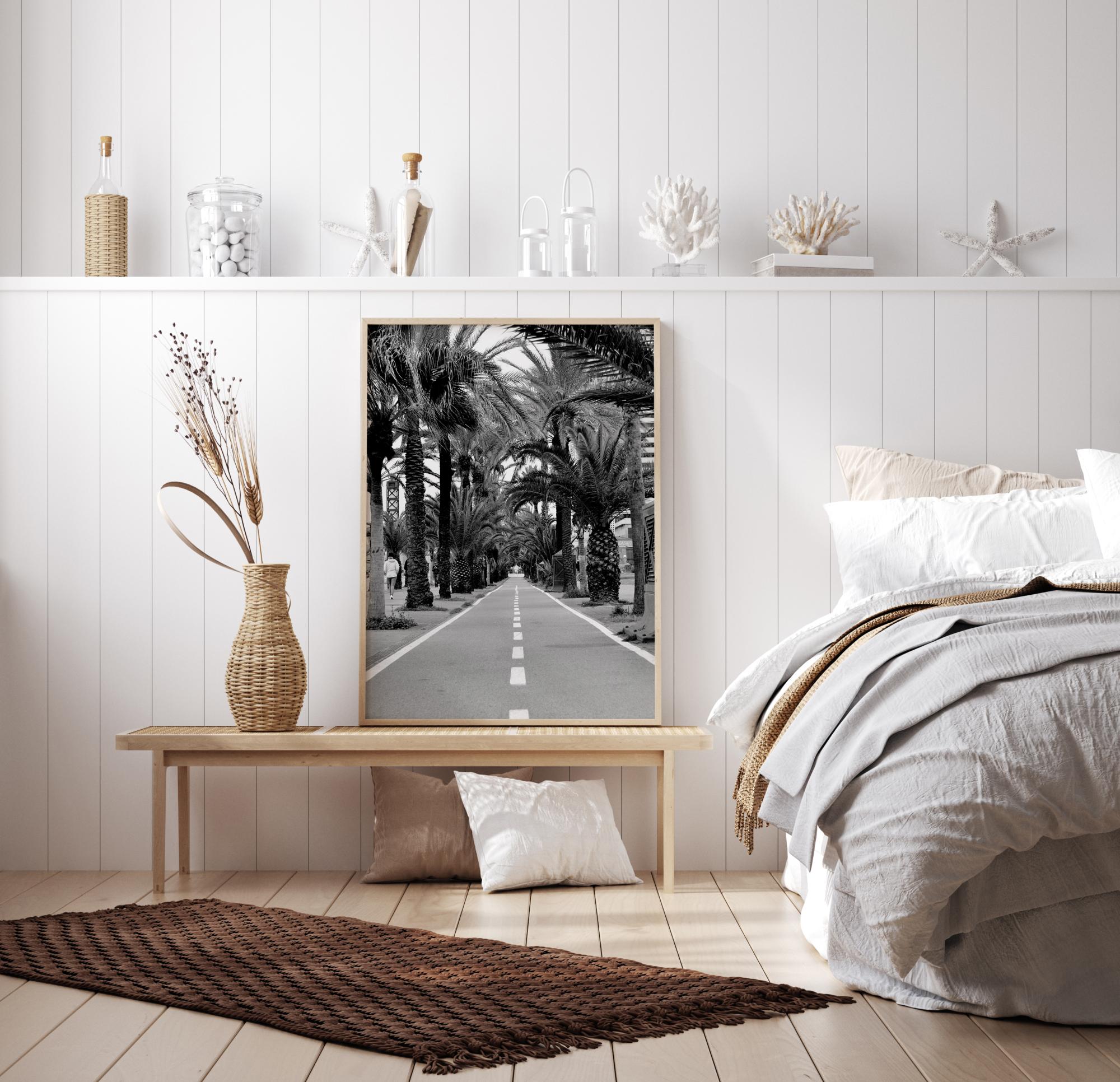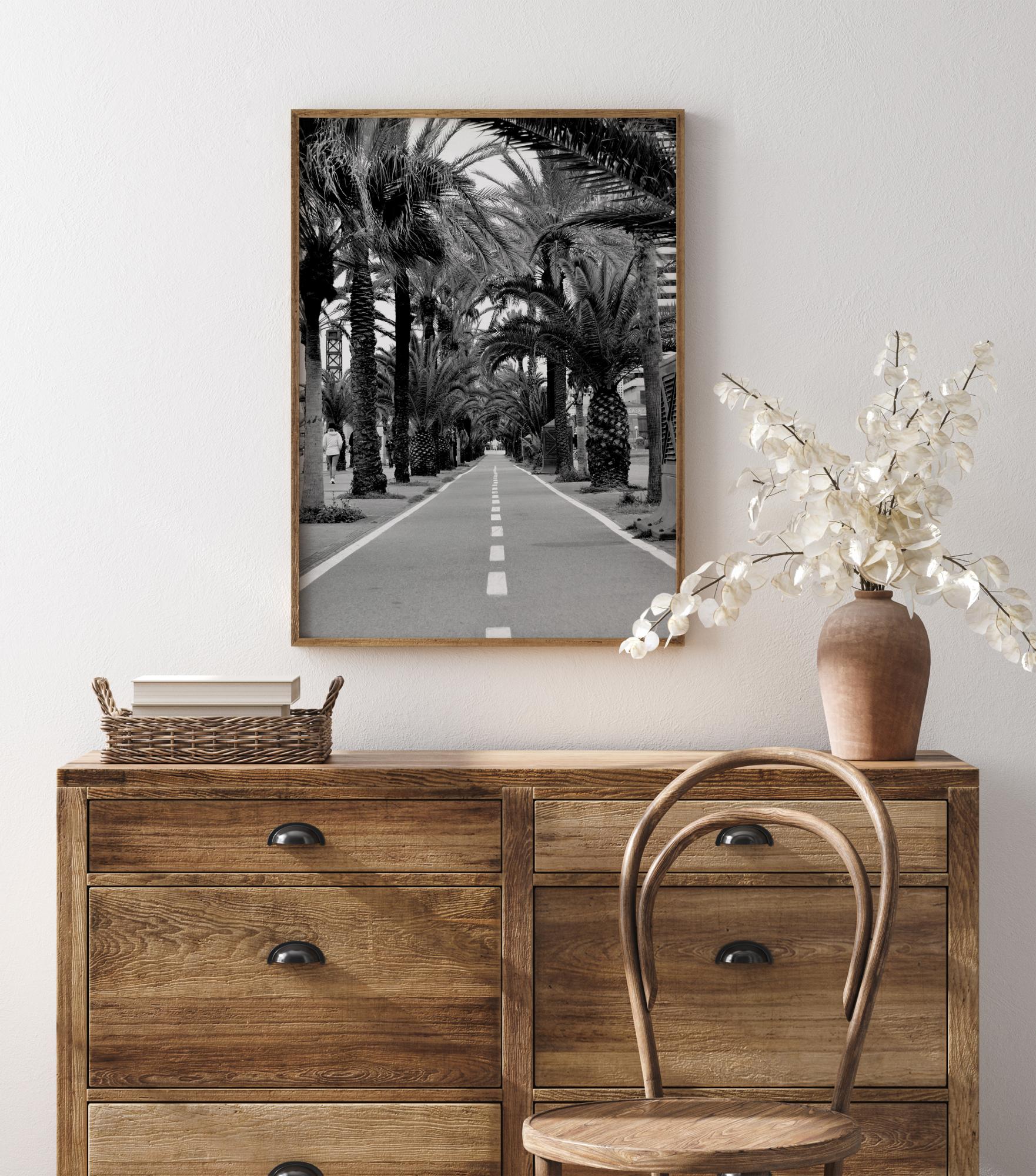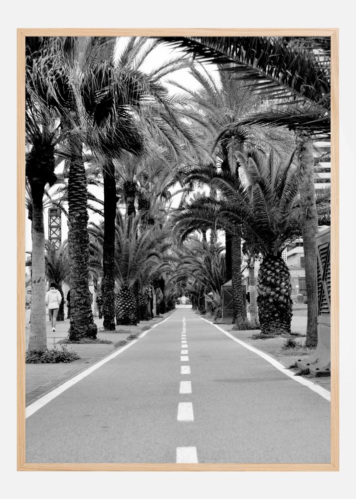 Plakat krajobrazowy z odcinkiem drogi biegnącym przez zagajnik palm. Palmy tworzą granicę dla drogi, podczas gdy białe linie prowadzą daleko w dal. Drzewa tworzą łuk, który kieruje wzrok w nowym kierunku. Umieść tę czarno-białą piękność na ścianie, aby uzyskać egzotyczny nastrój.