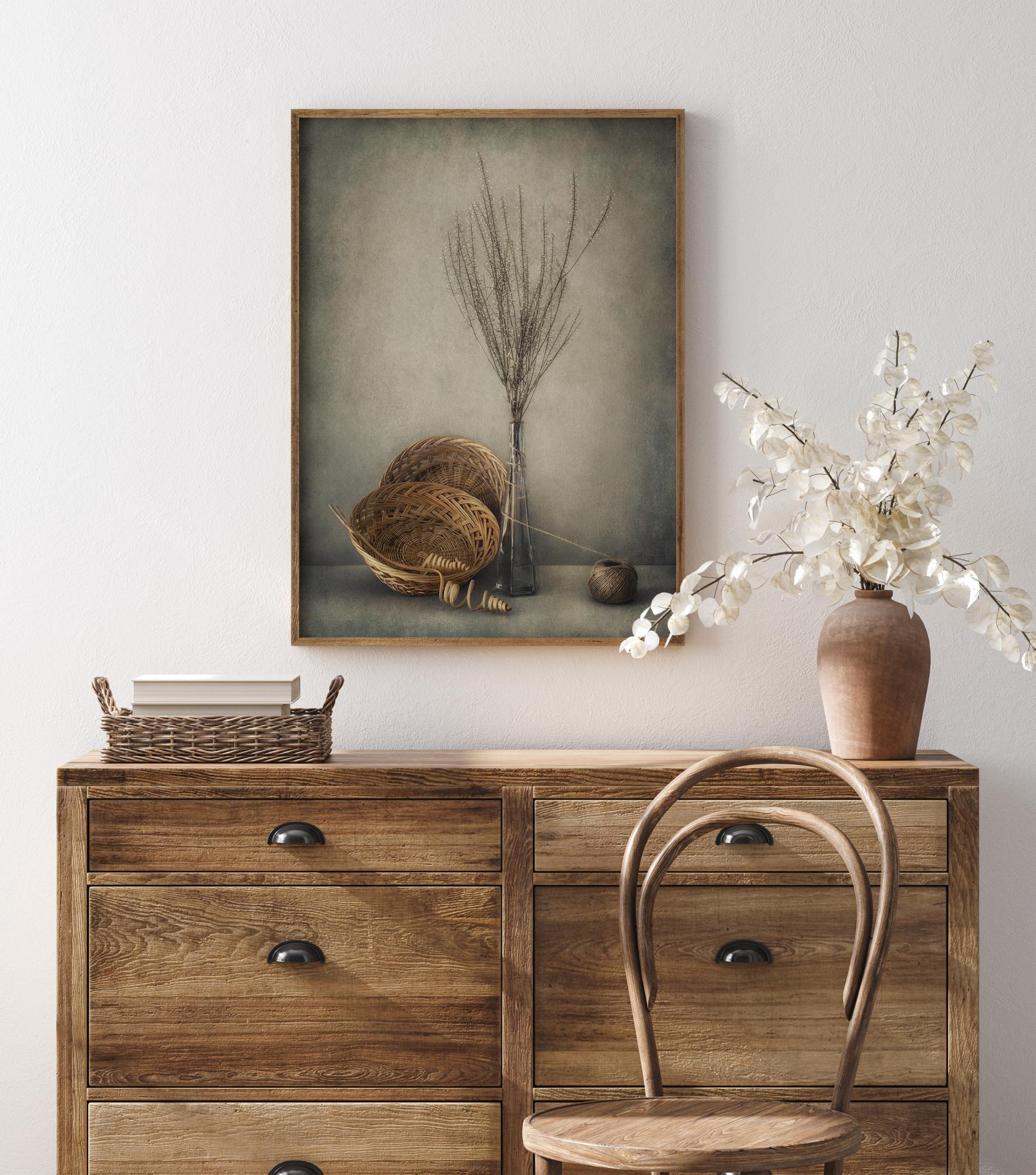 Plakat z martwą naturą z koszami, glinianą donicą oraz szklaną butelką z suszoną trawą. Ten obraz ma subtelne odcienie sepii i szarości, które tworzą miękkie i harmonijne dzieło. Wprowadź trochę spokoju do domu dzięki temu plakatowi i połącz go z neutralną ścianą, aby nie dominował za bardzo.