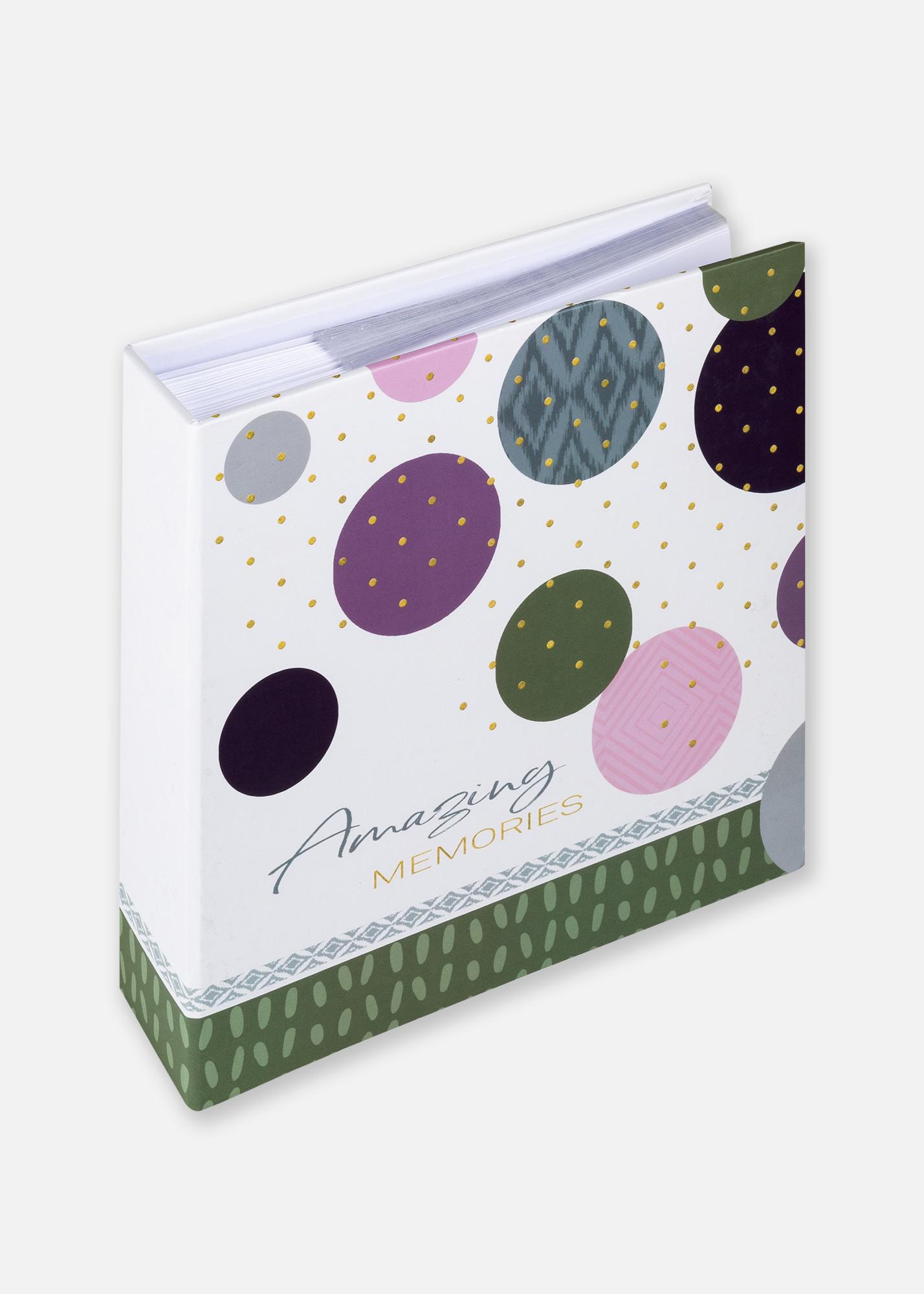 Radosne wspomnienia zasługują na radosne opakowanie! Ten album fotograficzny ma bardzo dekoracyjny i uroczy design, który pasuje do Twoich najdroższych wspomnień fotograficznych. Przednia okładka jest ozdobiona kolorowym wzorem składającym się między innymi z kół w różnych kolorach i rozmiarach, małych uroczych złotych kropek – oraz tytułem „Amazing memories”.