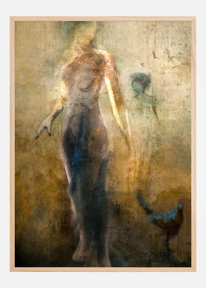 Przyciągnij wzrok tym tajemniczym i sugestywnym plakatem, który wydaje się opowiadać historię wykraczającą poza to, co widać. Motyw bada tematy tożsamości i pamięci poprzez postać wyłaniającą się z grunge'owego tła. Abstrakcyjny element dzieła sztuki powstaje dzięki rozmytemu, niemal upiornemu pojawieniu się postaci i subtelnym sugestiom sylwetki w tle, podczas gdy samotny ptak zdaje się unosić swobodnie.