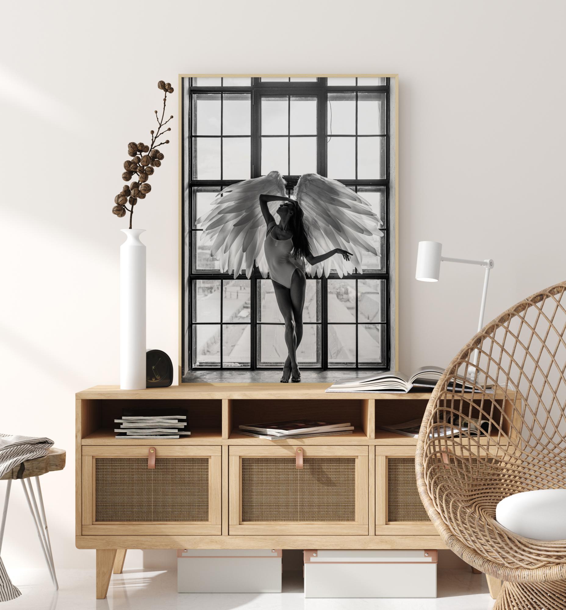 Piękny plakat z fotografią w ciemnej skali szarości przedstawiający kobietę pozującą w dużym oknie w body i z dużymi, pięknymi skrzydłami anioła. Plakat, który łatwo połączyć z innymi ulubionymi, ale również doskonale nadaje się jako samotny punkt przyciągający wzrok.
