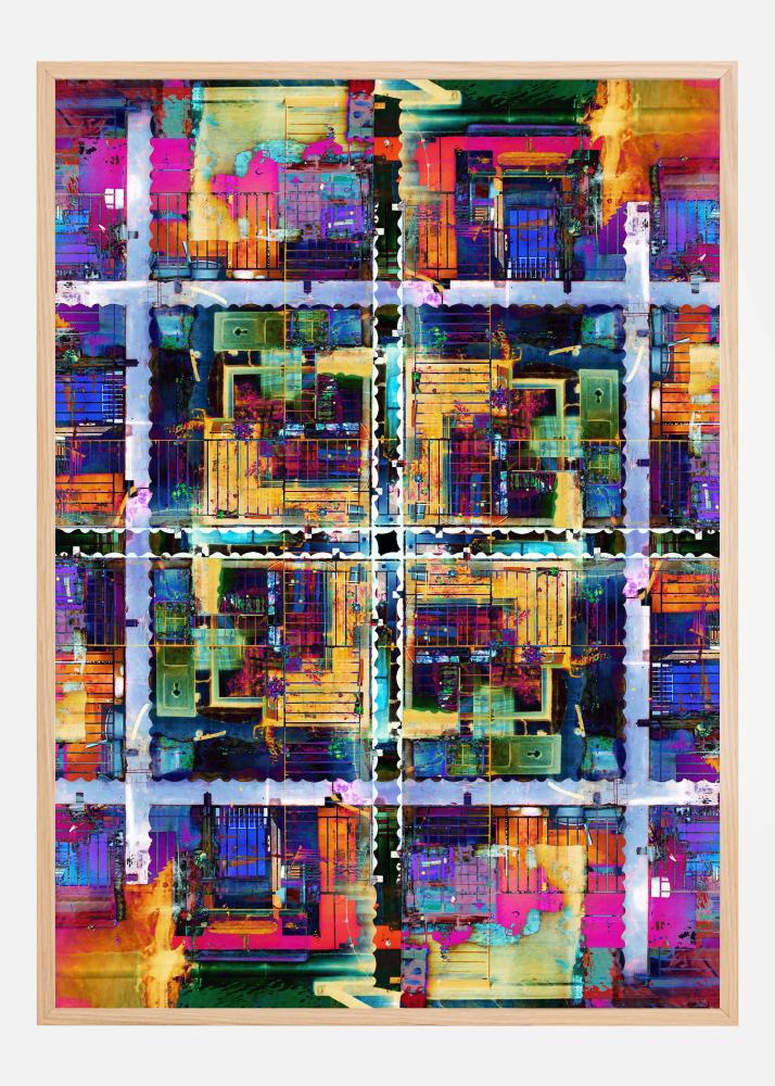 Neonowy plakat pełen abstrakcyjnych wzorów. Jak spektrum kolorów przypominające plamę oleju, ten obrazek przypomina przekrój różnych pomieszczeń. Każda kratka jest wypełniona wieloma kolorami, co czyni ten utwór fascynującym dziełem, które można oglądać przez godziny - najlepiej wygląda na neutralnej ścianie.
