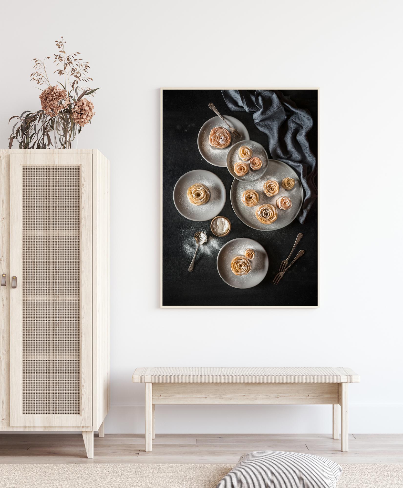 Prosty plakat przedstawiający południowy posiłek zaserwowany na tackach z różnymi słodkimi wypiekami. Te jabłkowe wypieki są niesamowicie delikatne, każdy posypany cukrem pudrem i uformowany na kształt delikatnej róży. Białe talerze i chrupiące złote wypieki wyróżniają się na czarnym obrusie. Z tym plakatem w domu poczujesz się gotowy na coś słodkiego.