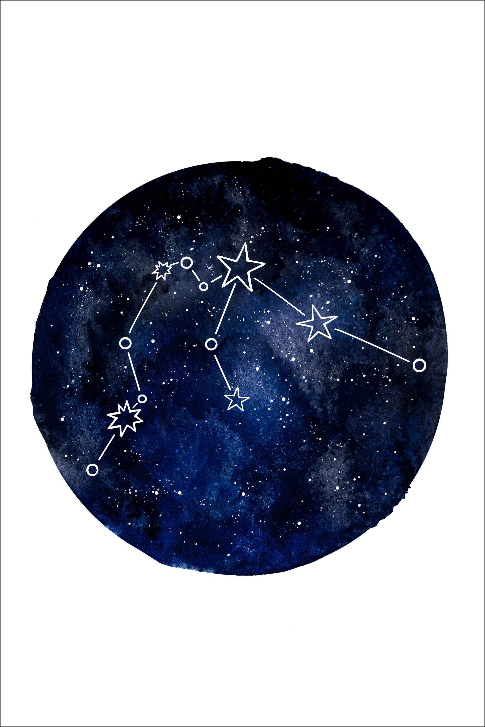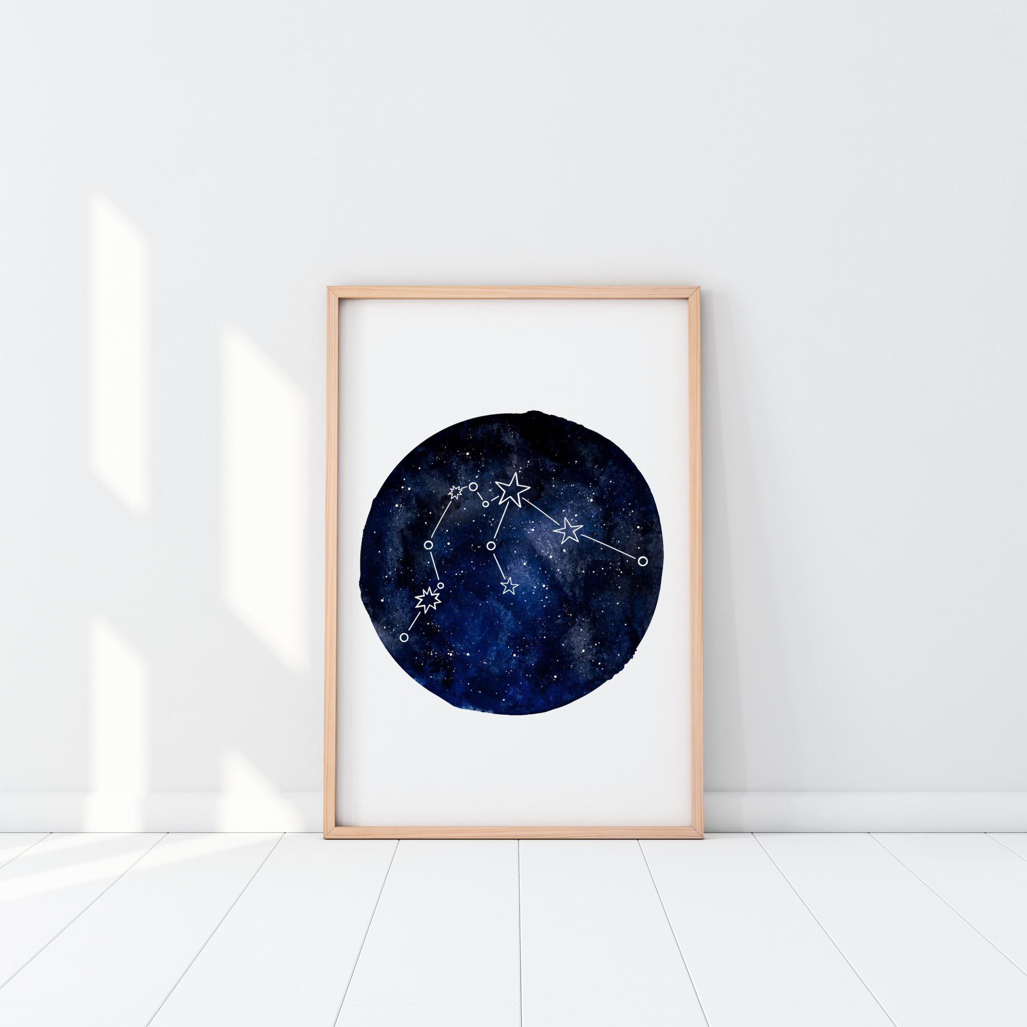 Abstrakcyjny plakat z znakiem zodiaku Wodnik. Zawieszona ciemnoniebieska kula z obrazem galaktyki, która podkreśla znak zodiaku. Kula jest umieszczona na prostej białej tle. Powieś go na dowolnej ścianie w domu, aby móc zobaczyć znak zodiaku na nocnym niebie.