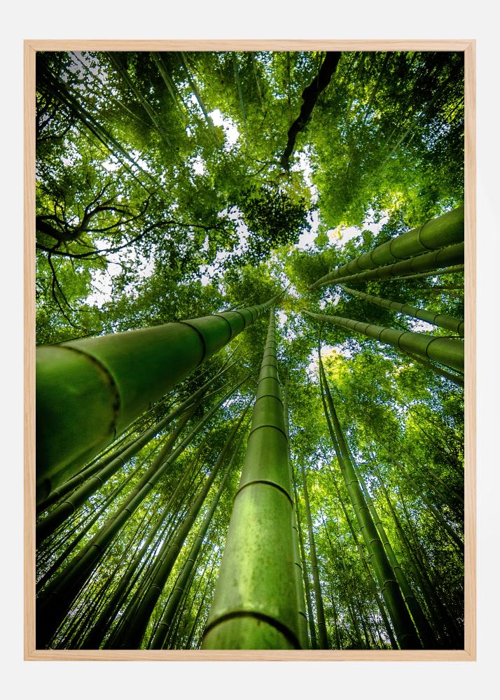 Plakat z motywem natury przedstawiający zielone rośliny bambusa. Spójrz w górę na niebo, gdy obraz jest otoczony grubymi łodygami bambusa prowadzącymi do zielonego sklepienia liści w niebie. Wyobraź sobie, że leżysz w tym spokojnym świecie dżungli, kiedy wprowadzasz ten obraz do swojego domu.