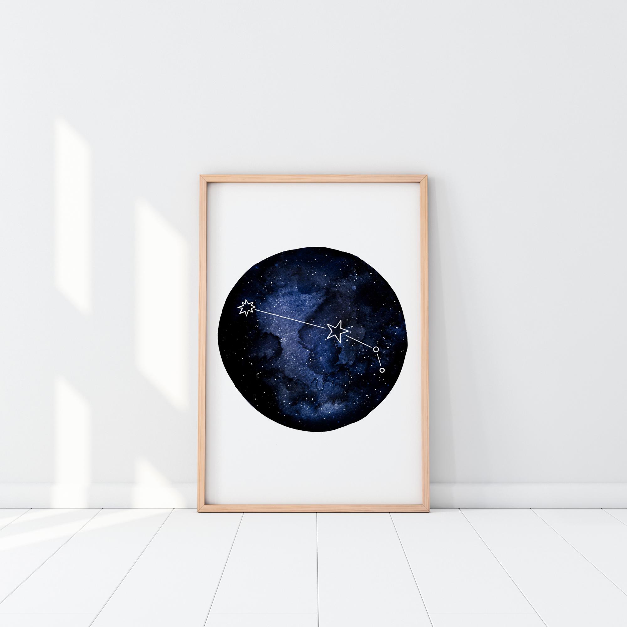 Abstrakcyjny plakat zodiakalnego znaku Barana. Zawieszona ciemnoniebieska kula z obrazem galaktyki oraz konturem znaku zodiaku. Kula wisi na zwykłym białym tle. Powieś go na ścianie w swoim domu i sprawdź, czy możesz dostrzec ten znak zodiaku na nocnym niebie.
