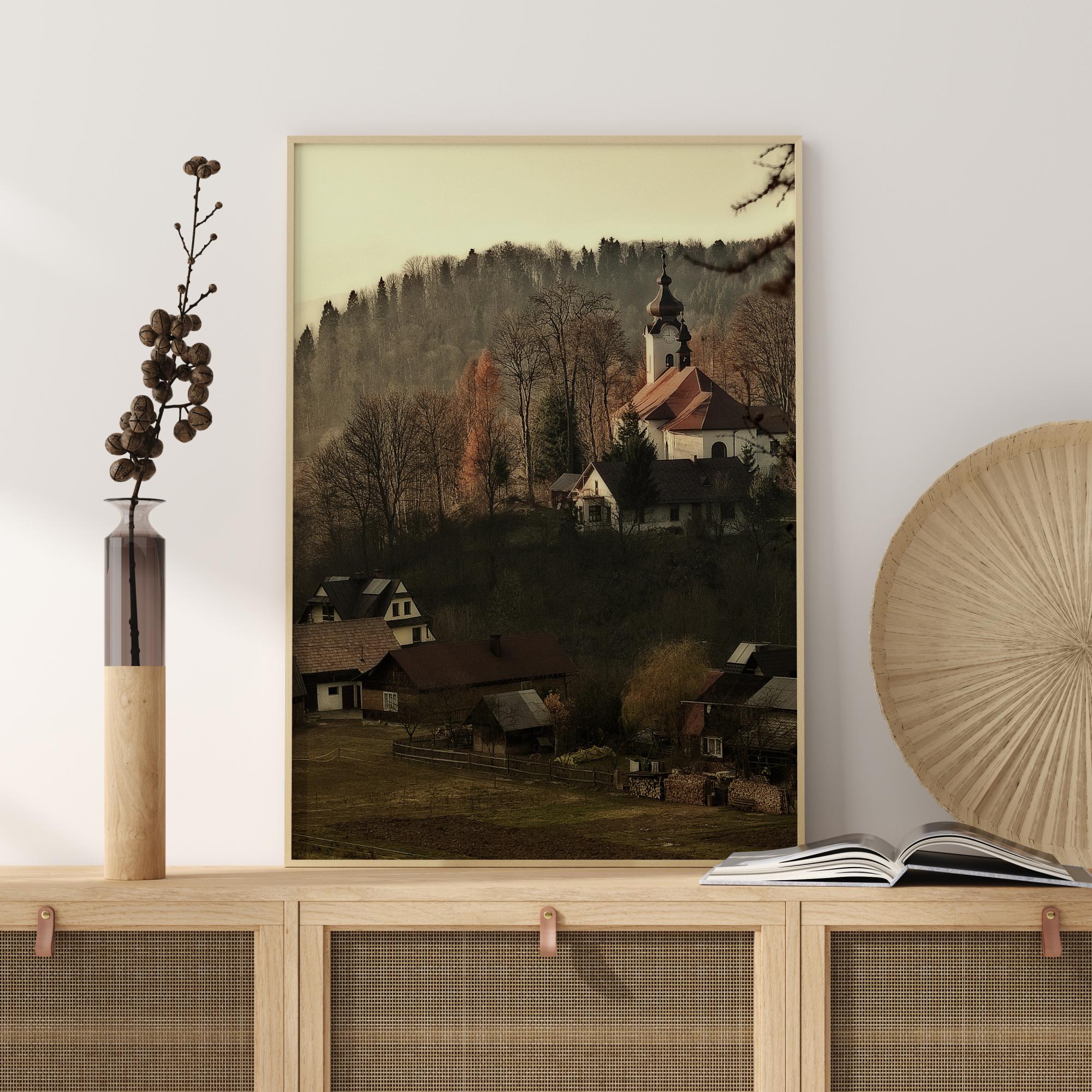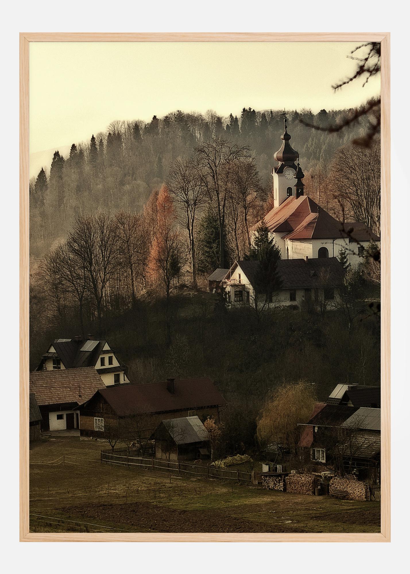 Plakat miejski z małej wioski na wsi z starymi domami i polami z zalesionymi wzgórzami w tle. Biała wieża kościelna stoi wysoko na tle przytłumionych brązowych i zielonych kolorów krajobrazu. Zanurz się w swoim wyobrażeniu tej malowniczej wioski, wieszając plakat na ścianie.