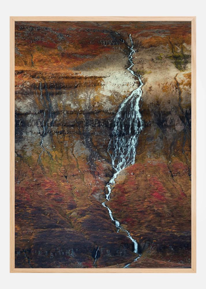 Fantastyczny plakat przyrodniczy z małym wodospadem płynącym po pokrytych mchem kamieniach. Żółte, czerwone i pomarańczowe kolory wypełniają obraz ciepłymi tonami, gdy jasny biały strumień kaskaduje po skałach. Śledź ruchy wody na tym fascynującym plakacie, gdy eksponujesz go w domu.