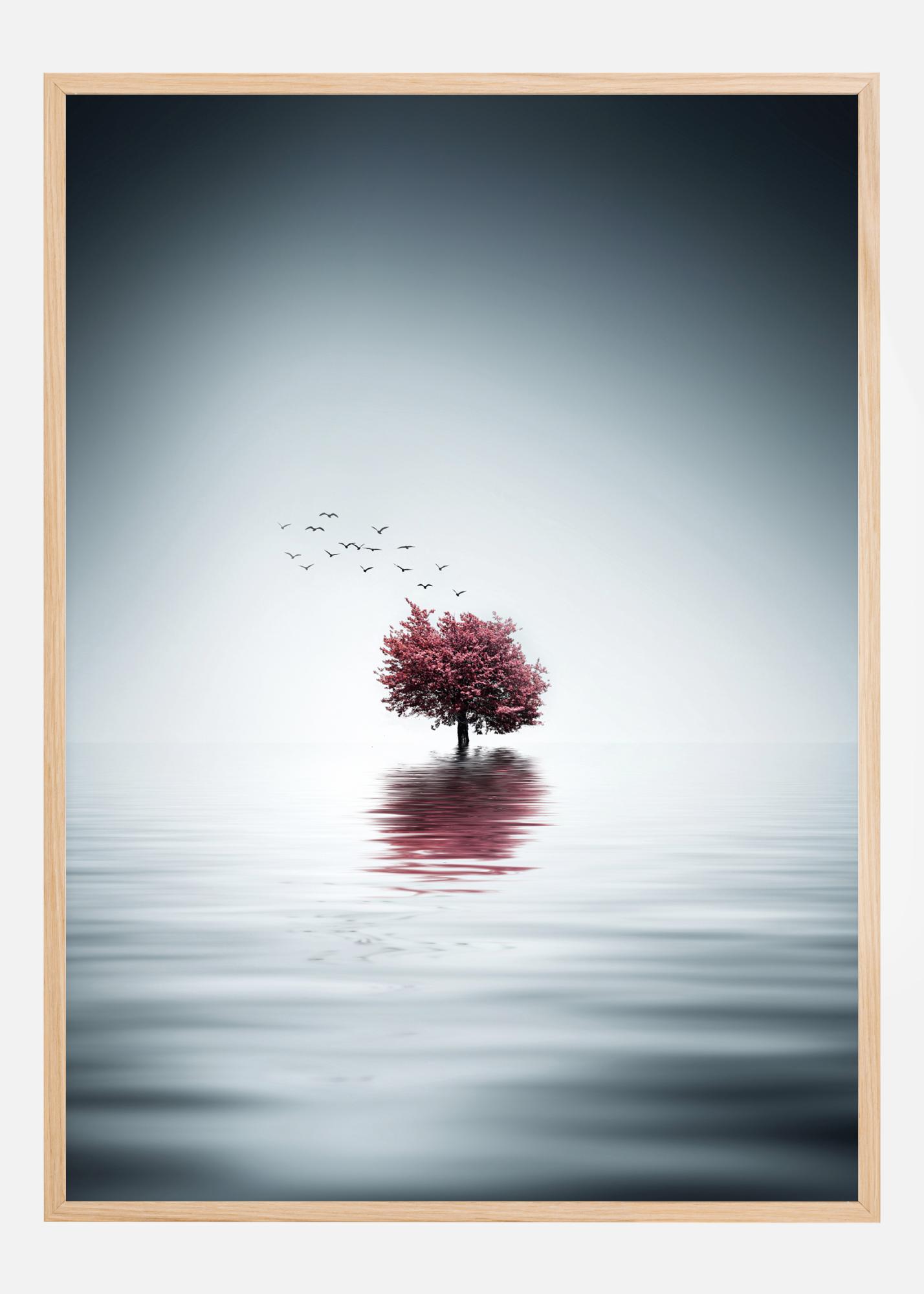 Prosty plakat przyrodniczy jeziora z samotnym drzewem na środku. Intensywne kolory i fale przyciągają wzrok do małego drzewa wiśniowego z różowymi kwiatami. Stado ptaków odlatuje w aurze światła. Możesz naprawdę poczuć mistykę natury na tym obrazie.