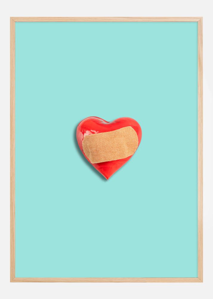 Ten skłaniający do refleksji plakat przedstawia czerwone serce z plastrem, na uspokajającym turkusowym tle. Symbolika jest silna i otwarta na interpretację, niezależnie od tego, czy chodzi o uzdrowienie złamanego serca, czy troskę o nasze emocjonalne rany. Żywy kontrast między czerwonym sercem a uspokajającym tłem nadaje obrazowi głęboką i emocjonalną rezonansję.
