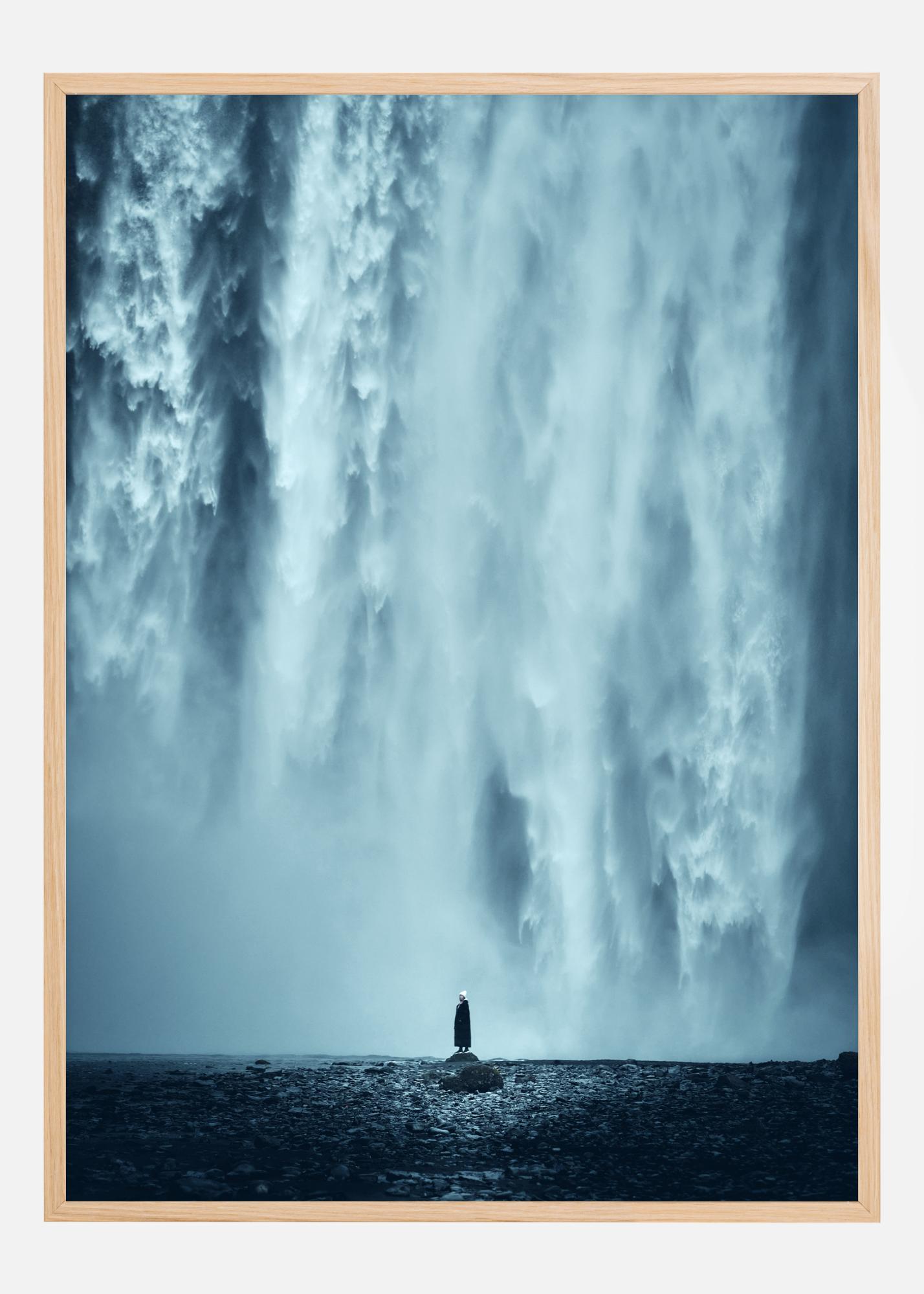 Epicki plakat przedstawiający niesamowitą moc natury poprzez wodospad. Dramatyzm dopełnia mała czarna postać w środku obrazu, wpatrująca się w spadającą wodę. Niebiesko-biały wodospad wywołuje poczucie podziwu w tym wspaniałym obrazie.