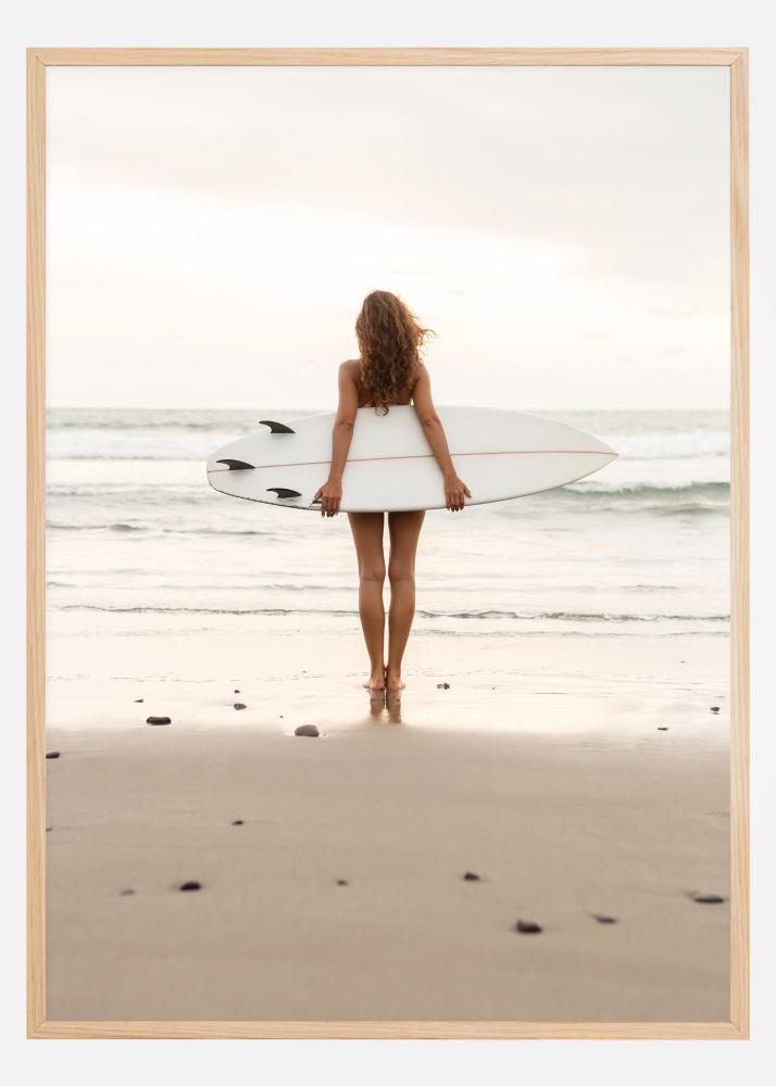 Wspaniałe zdjęcie kobiety na plaży, trzymającej deskę surfingową za plecami, spoglądającej ku horyzontowi. Prawdziwy plakat feel good z miękkimi tonami i kształtami. Pasuje do większości domów i stylów wnętrzarskich.