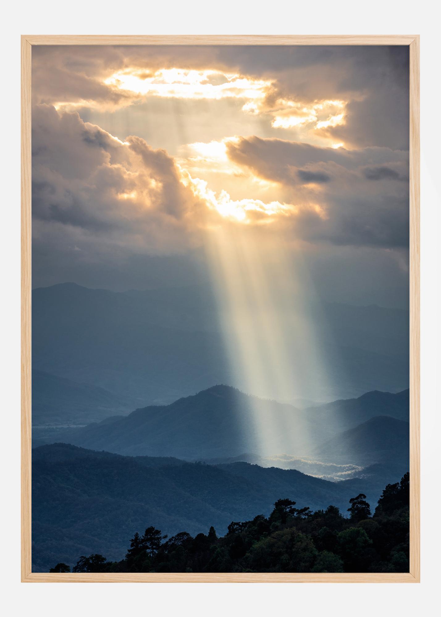 Ten inspirujący plakat przedstawia majestatyczny krajobraz, w którym promienie słońca przebijają się przez chmury, oświetlając pofałdowane góry. To scena, która uchwyca wzniosłe piękno natury, z dramatycznym niebem kontrastującym z łagodnie konturowanymi górami. Cienie i światło igrają na krajobrazie, tworząc silne poczucie głębi i przestrzeni.
