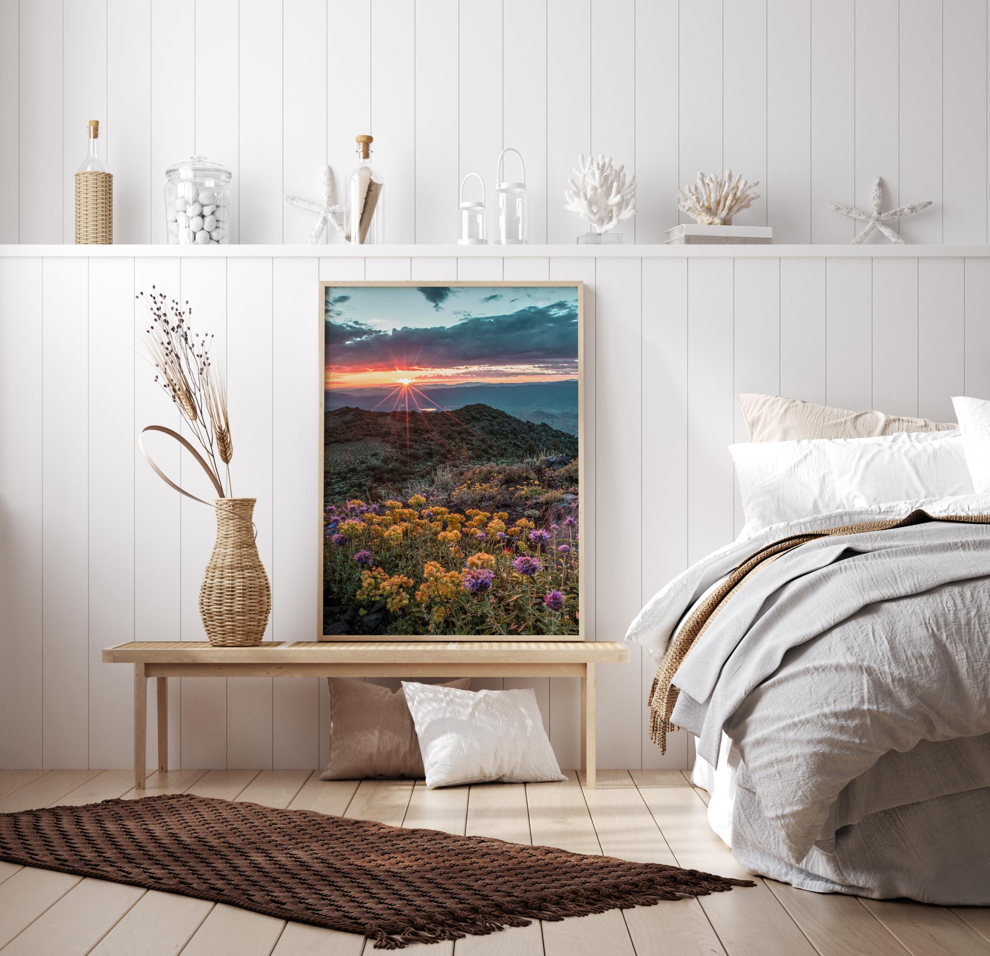 Plakat przyrodniczy z dzikimi kwiatami na zboczu góry na tle niesamowitego zachodu słońca. Piękne żółte i fioletowe kwiaty wypełniają obraz, prowadząc wzrok do szczytów gór i zamglonego nieba. Zachód słońca wygląda jak czerwona gwiazda, co tworzy wyrazisty punkt skupienia. Powieś to dzieło na swojej ścianie, aby doświadczyć części natury w domu.