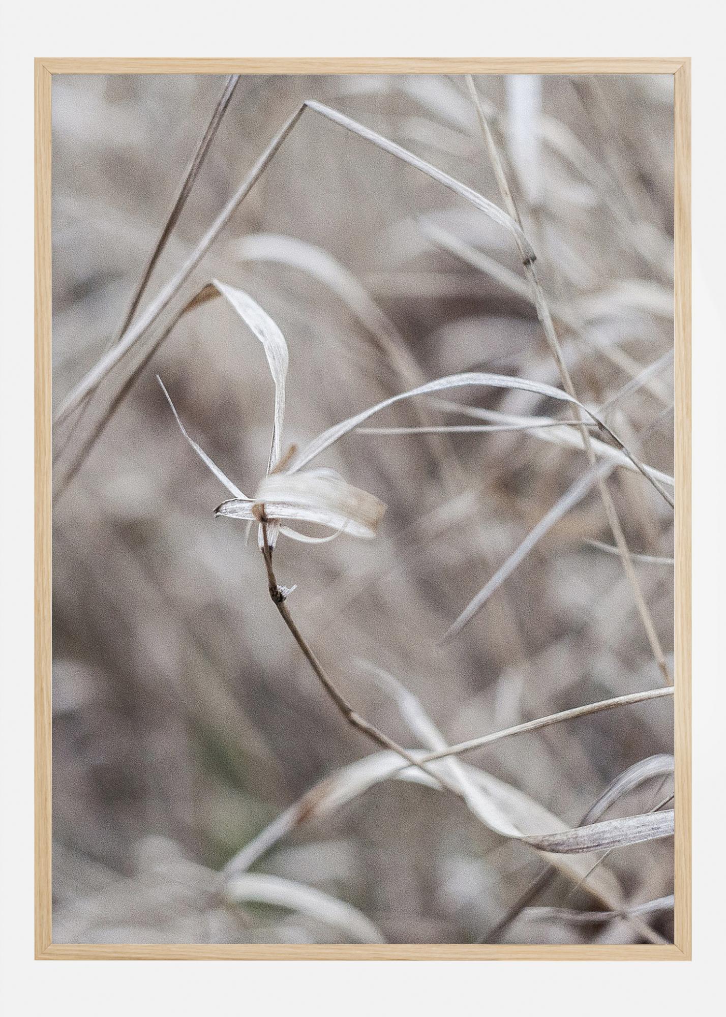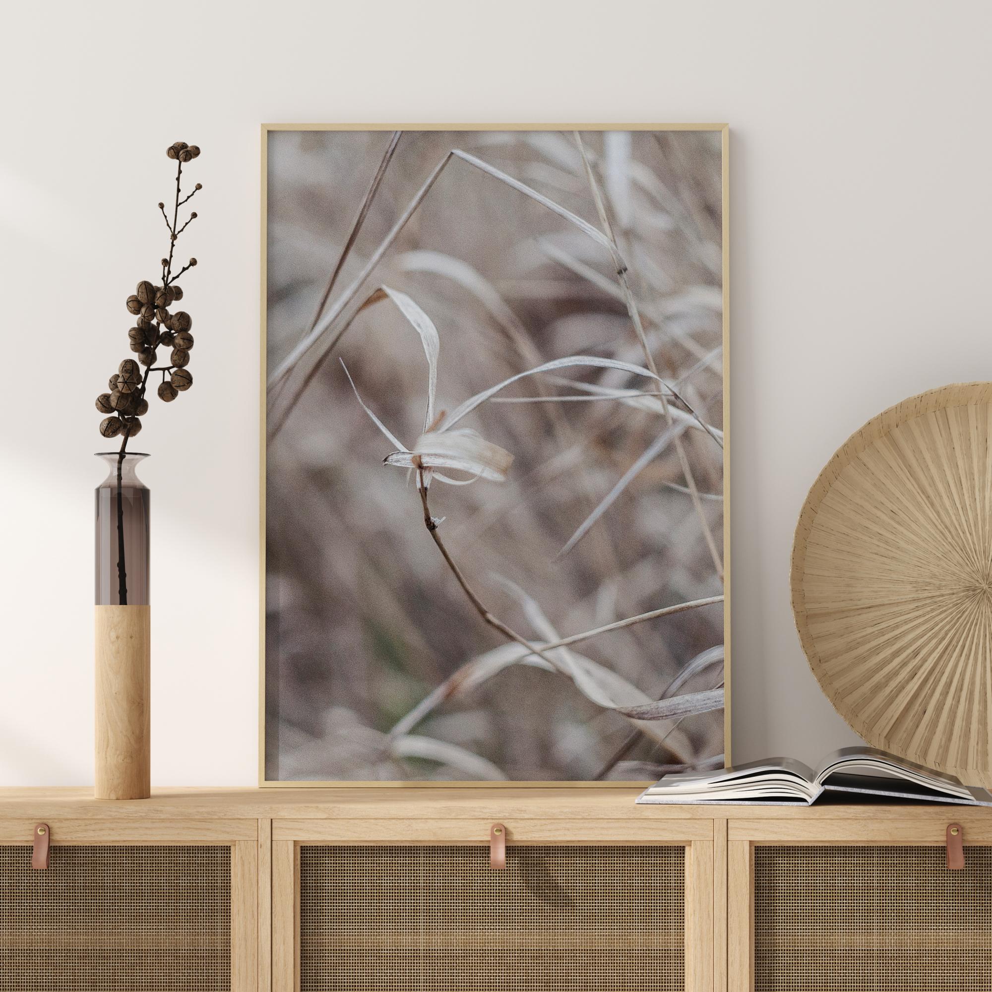 Elegancki plakat przyrodniczy z bliskim ujęciem miękkich liści. Miękkie łodygi i liście prowadzą wzrok po dziele. Wrażenie głębi powstaje dzięki temu, że tło jest poza ostrością. Powieś ten obraz na jasnej jednokolorowej ścianie, aby delikatne neutralne pastelowe kolory się wyróżniały.