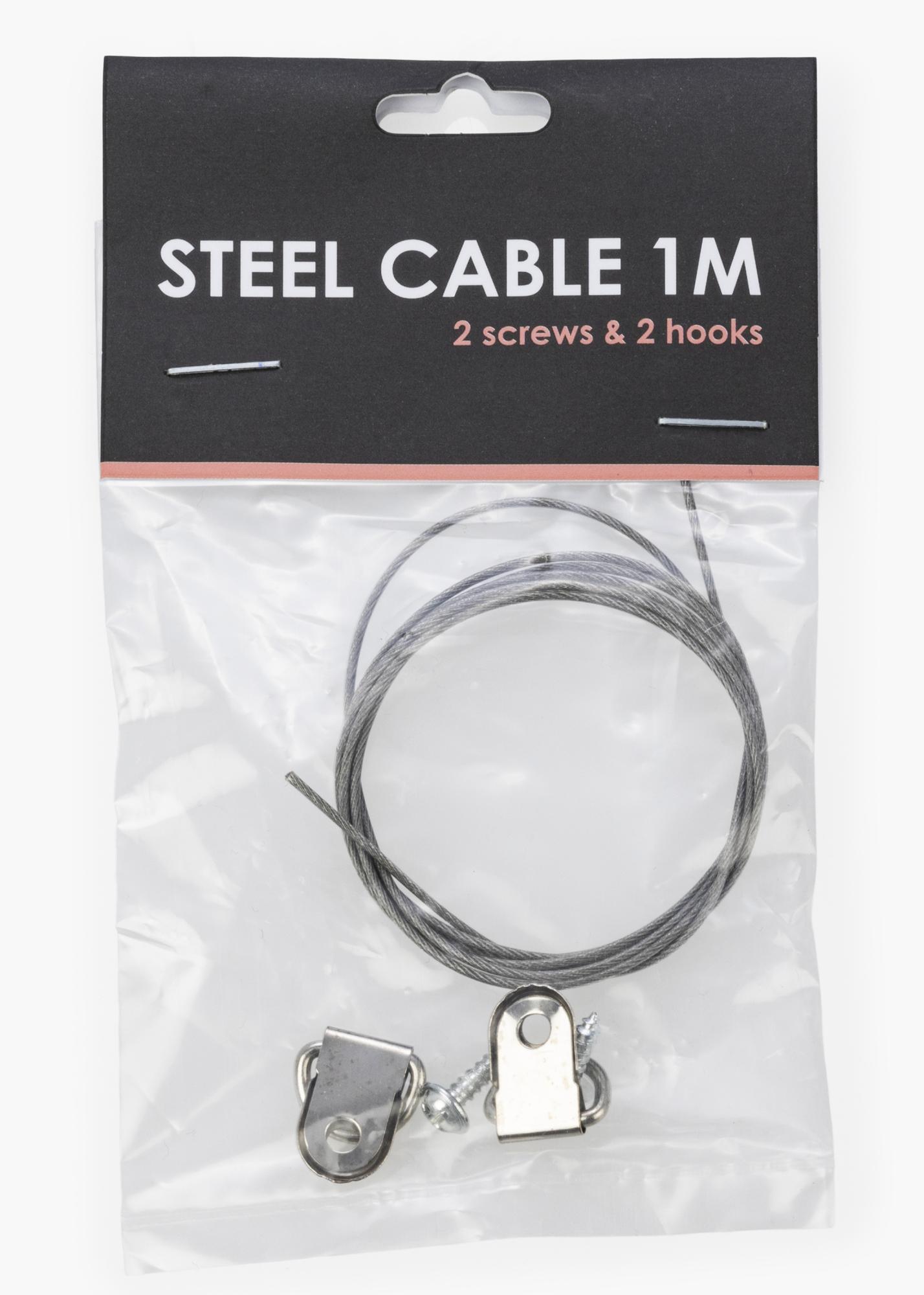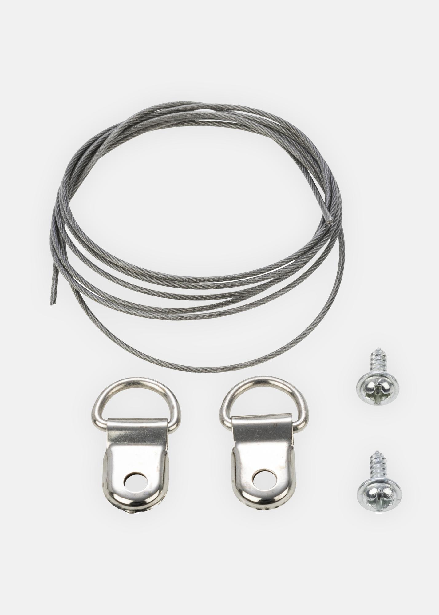 Za pomocą tego kompletnego zestawu masz wszystko, czego potrzebujesz do zamontowania stalowej linki na swojej tablicy: 1-metrowa stalowa linka, 2 wkręty i 2 oczka/haczyki. Stalowa linka jest ocynkowana i wytrzymała, lecz ma jedynie 0,7 mm grubości, co sprawia, że jest łatwa w obróbce, ponieważ można ją zginać i skręcać według potrzeby.