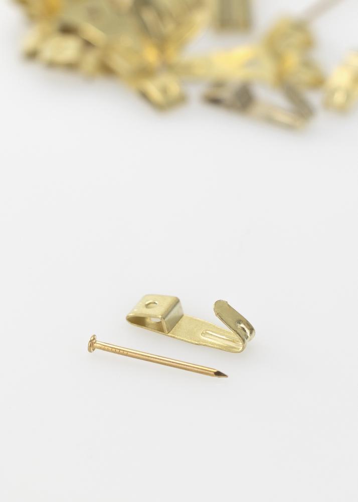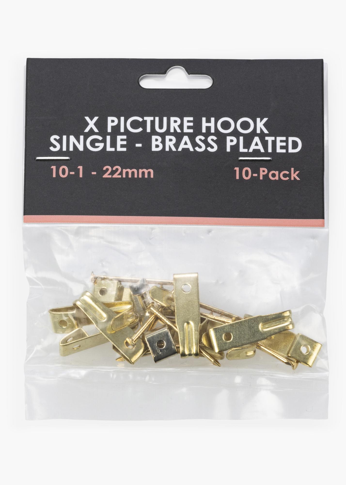 Hak X do montażu na ścianie drewnianej lub gipsowej. Wytrzymuje obciążenie do 5 kg. Kolor mosiężny.