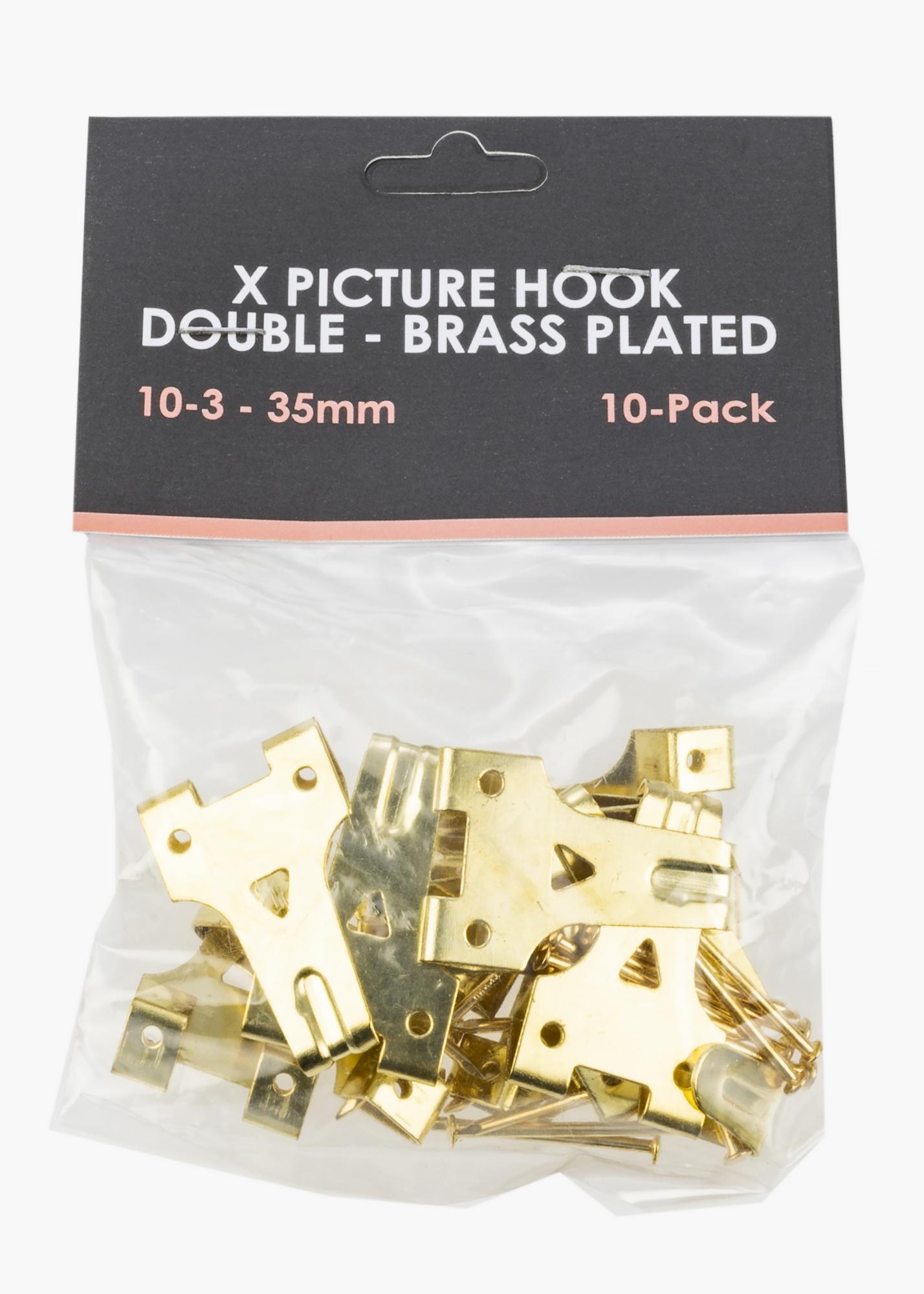 Podwójny hak X do montażu na ścianie drewnianej lub gipsowej. Wytrzymuje obciążenie do 10 kg. Kolor mosiężny.