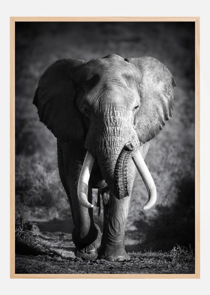 Ten potężny i fascynujący plakat przedstawia słonia w czarno-białej kolorystyce, co podkreśla pomarszczoną skórę i duże kły tej wspaniałej istoty. Godna obecność słonia jest uchwycona w szczegółach, a jego spokojne spojrzenie oferuje poczucie mądrości i ponadczasowości. Ten obraz idealnie pasuje dla każdego, kto docenia dzikie zwierzęta i potężne piękno natury i chce dodać wyrazisty i skłaniający do refleksji element do swojego domu lub biura.