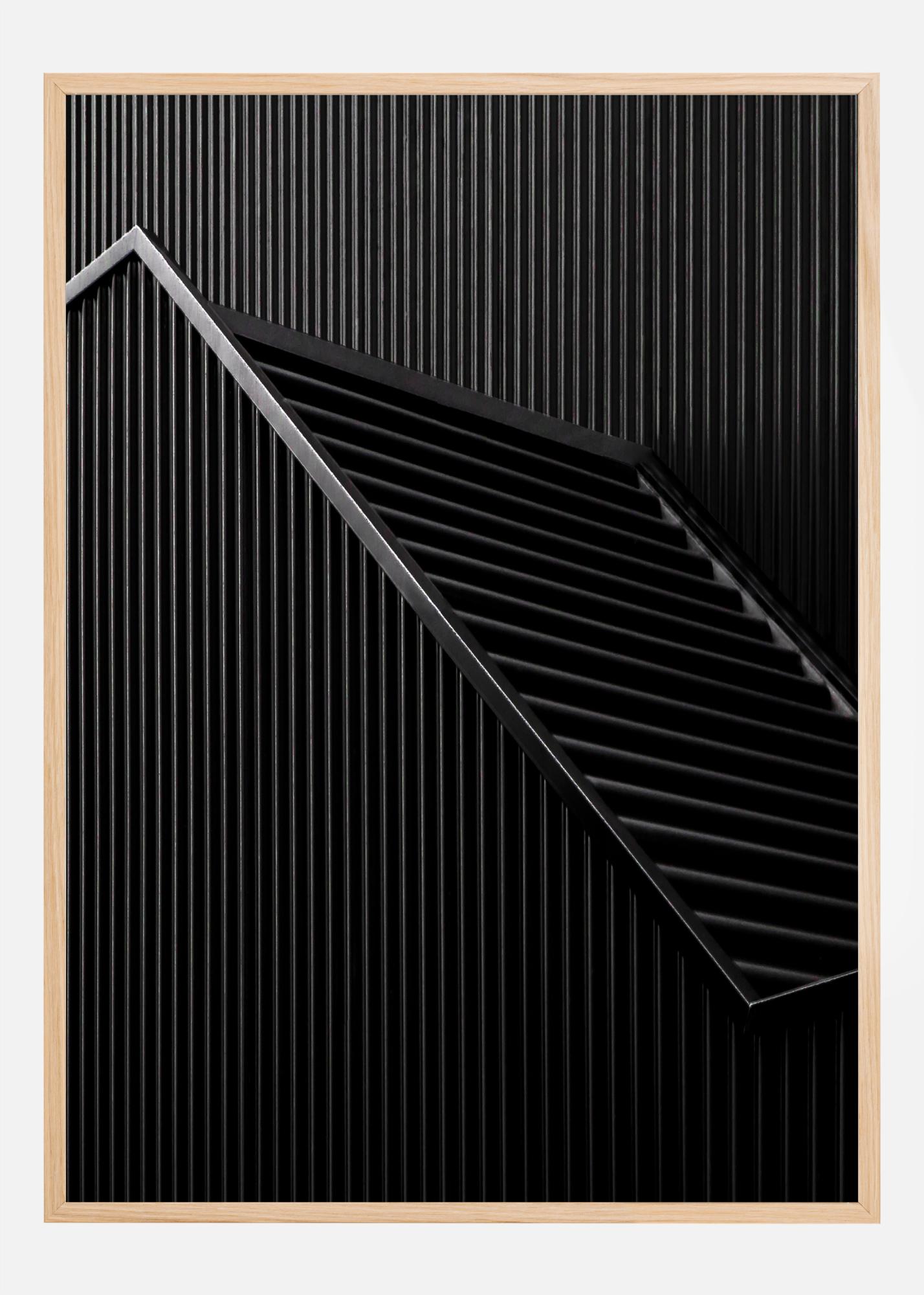 Geometryczny plakat z zestawem schodów, lub dachów, przy ścianie. To czarno-białe zdjęcie przypomina obraz Eschera. Podążaj za liniami drewna, gdy przecinają się pod różnymi kątami wokół dzieła, tworząc niesamowite widowisko. Umieść ten obraz na białej ścianie, aby uzyskać jeszcze bardziej dramatyczny efekt.