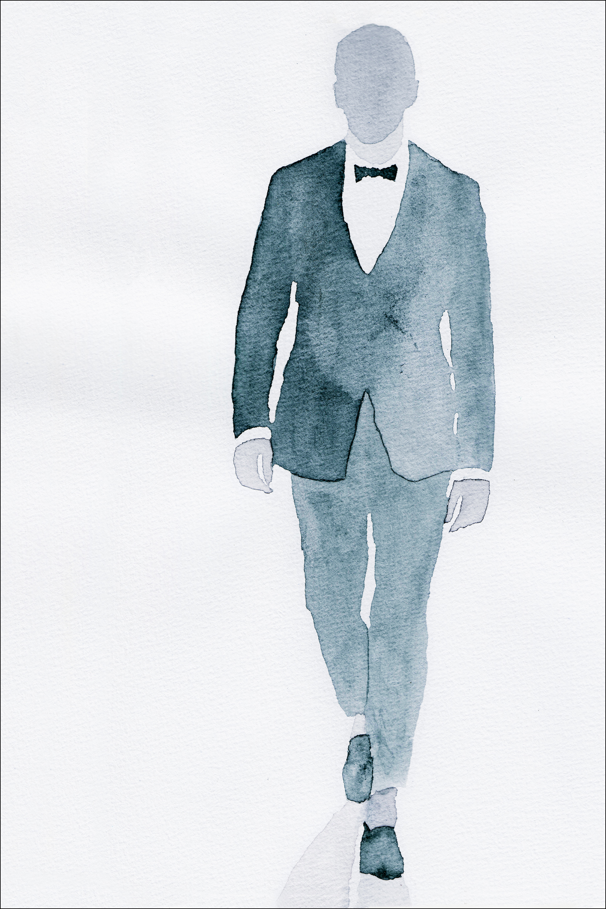 Plakat portretowy z mężczyzną w smokingu idącym. Prosty, ale skuteczny, ten niebieski obrazek pokazuje sylwetkę, ale bez pokazywania żadnych szczegółów. Kim jest ten tajemniczy mężczyzna? To zależy od Ciebie, aby zdecydować, kiedy zawiesisz obraz w domu.