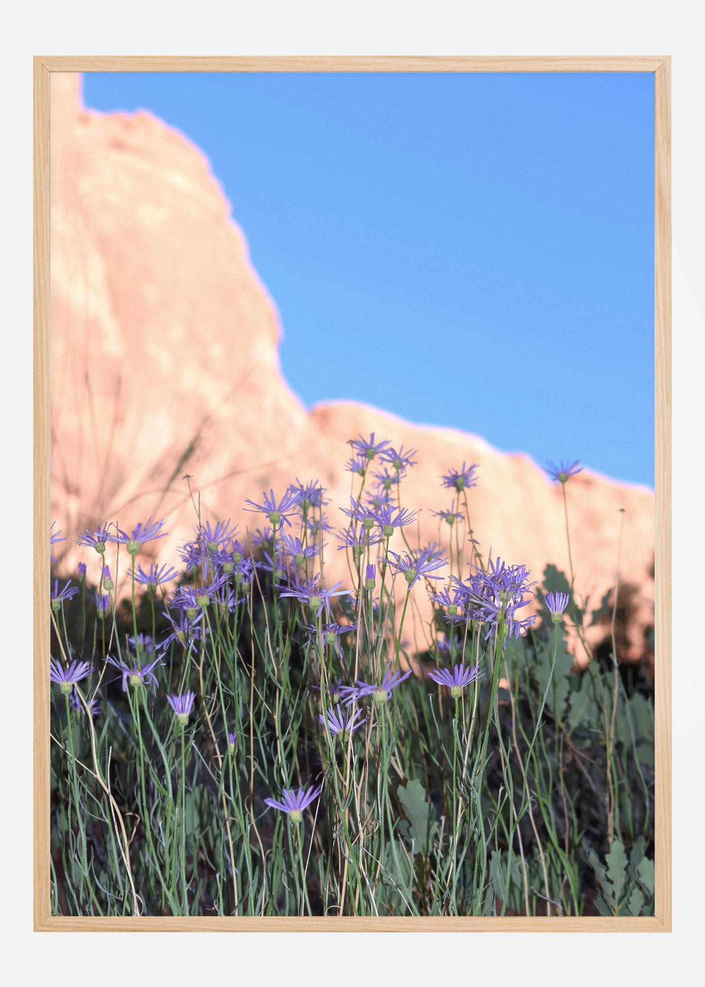 Oszałamiający naturalny plakat z fioletowymi kwiatami, skalistymi górami i intensywnie niebieskim niebem. Fioletowe kwiaty są w centrum uwagi i wznoszą się ku niebu, podczas gdy pomarańczowa góra stanowi granicę szerokiego rozległego nieba. Daj się zagubić w naturze, gdy przyniesiesz to dzieło do domu i powiesisz je w swojej sypialni.
