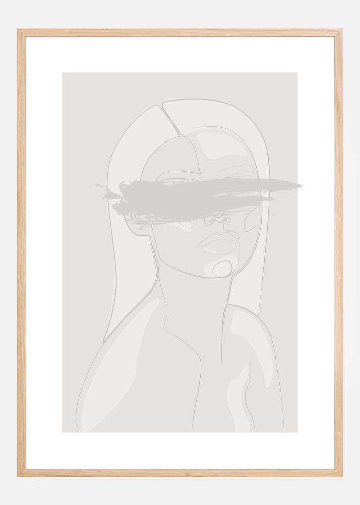Abstrakcyjny plakat z kobietą o zakrytych oczach. Ten blady biały i szary obraz przedstawia głowę i ramiona kobiety w formach blokowych i liniach. Rozprysk koloru zakrywa oczy, tworząc tajemnicę wokół kobiety. Mocna biała ramka otacza ją, idealna do zawieszenia na śmiało kolorowej ścianie w domu.