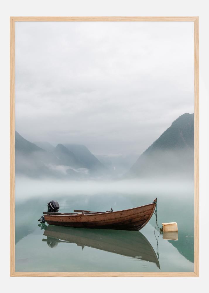 Elegancki plakat z łodzią pośrodku mgielnego jeziora. Brązowa łódź wyróżnia się wyraźnie na pierwszym planie z ostrym odbiciem w wodzie. W tle, spowite mgłą, znajdują się łagodne góry wyłaniające się z wody. Wprowadź spokój otwartego krajobrazu do swojego domu.