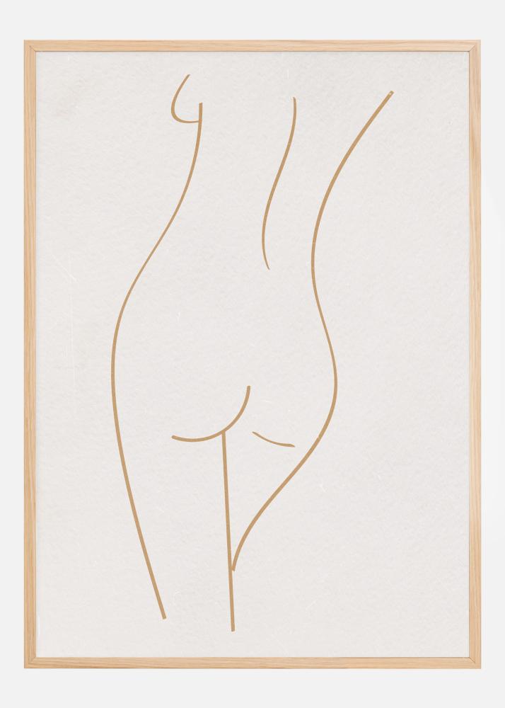 Prosty rysunkowy plakat z kobietą odwróconą tyłem do ciebie. Cienkie brązowe linie to wszystko, co jest potrzebne do stworzenia formy tej kobiety pozującej od tyłu. Linie prowadzą wzrok w górę wzdłuż pleców w tym prostym, ale eleganckim rysunku na białym tle.