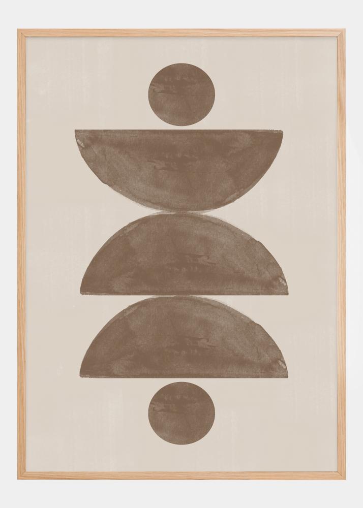 Ten kojący i estetycznie satysfakcjonujący plakat przedstawia harmonijne układanie miękkich geometrycznych form. Dwa półksiężyce w ziemistym brązowym odcieniu są zrównoważone przez dwie pełne okręgi, umieszczone symetrycznie powyżej i poniżej. Ta minimalistyczna kompozycja oferuje poczucie spokoju i jest doskonałą reprezentacją bohemyjskiego stylu z łagodnym i nowoczesnym urokiem.