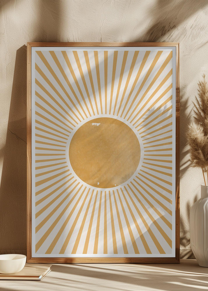 Ten żywy plakat wywołuje uczucie promiennego słońca dzięki swojemu promieniującemu złotemu wzorowi otaczającemu centralny żółty okrąg na miękkim białym tle. Projekt jest inspirowany bohemowymi i geometrycznymi wzorami, które razem tworzą obraz ciepła i energii słońca. Ciepłe kolory i promienisty wzór są zaprojektowane, aby przynieść poczucie radości i pozytywności.