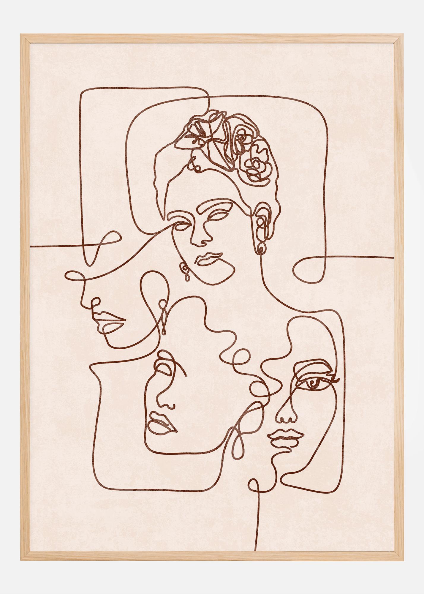 Dodaj swojemu domowi artystyczny akcent dzięki temu eleganckiemu plakatowi, który celebruje piękno i siłę kobiecości. W jednym, splecionym linii wyłaniają się cztery kobiece twarze jako obraz jedności i różnorodności. Każdy profil jest przedstawiony z prostotą, która przemawia do wyobraźni widza, co czyni ten plakat idealnym rozpoczęciem rozmowy. Tło w wyrafinowanym beżowym odcieniu zaprasza do poczucia ciepła i miękkości, podczas gdy brązowe linie oferują silny wizualny kontrast.