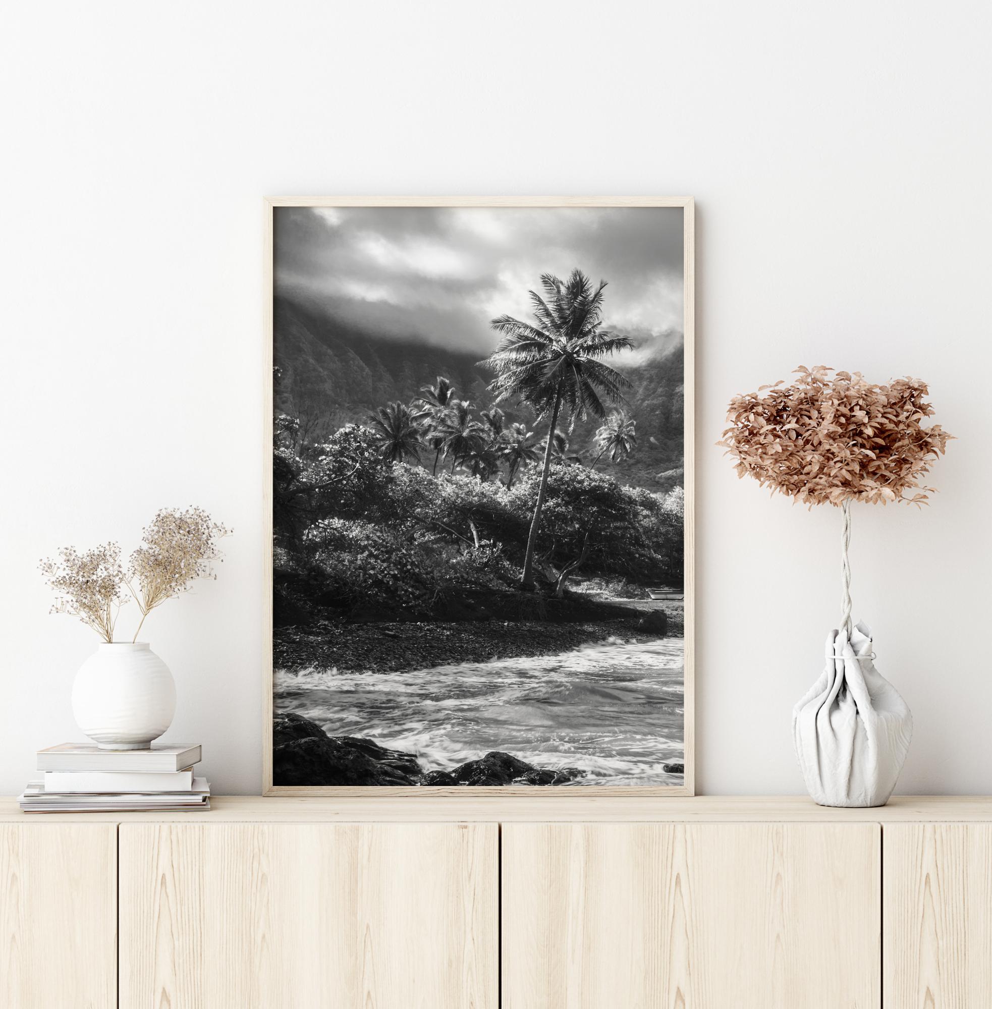 Plakat przyrodniczy z nadciągającą burzą, gdzie morze spotyka ląd. Pochmurne niebo rzuca cień na zdjęcie, podczas gdy palmy kołyszą się na wietrze. Pieniące się morze uderza o kamienistą plażę dla dodatkowego efektu. Stwórz trochę dramatyzmu w domu z tym czarno-białym dziełem na neutralnej ścianie.
