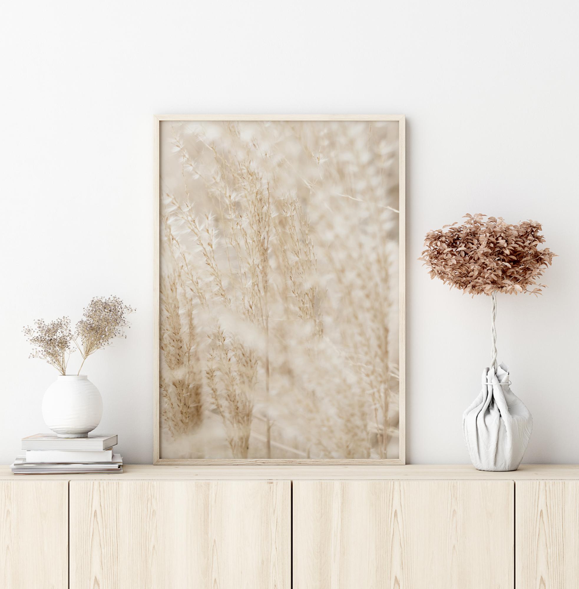 Miękko złocony plakat z polem. Obraz jest relaksujący, z kłoskami pszenicy delikatnie w centrum uwagi, miękkie końce są oświetlone prawie anielskim białym światłem. Dla nieco kojącego eterycznego widoku, to idealne dzieło, które warto powiesić na jednej z kontrastujących ścian domu.