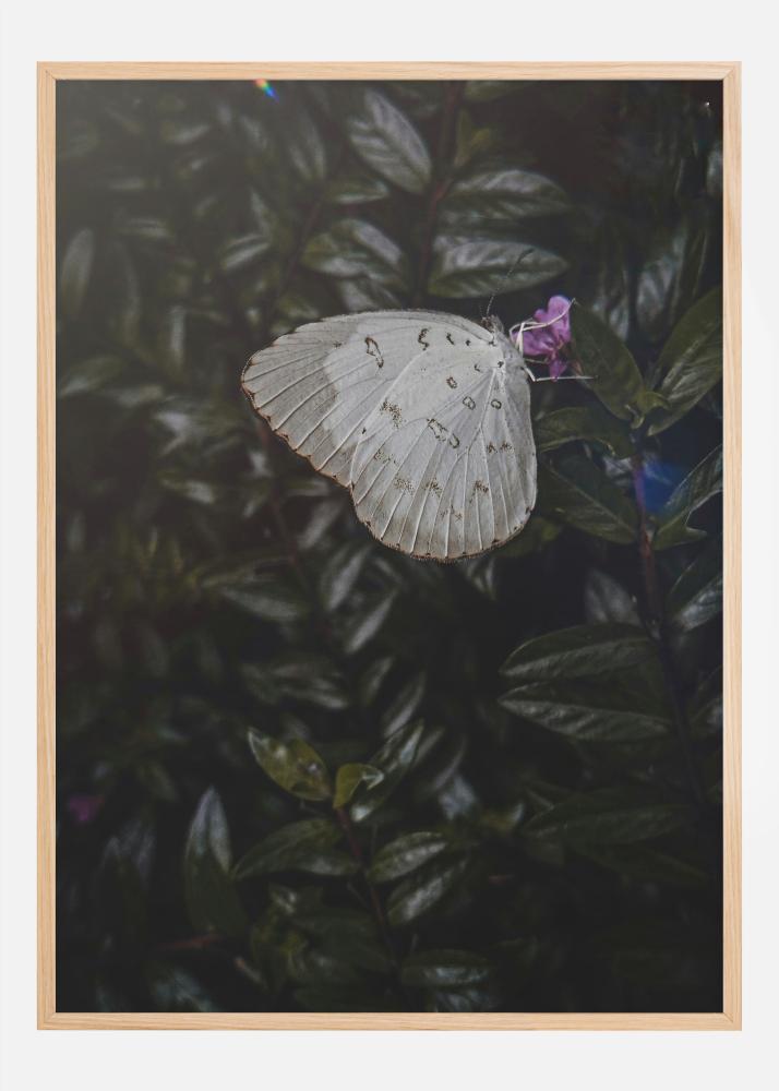 Odkryj ciche piękno natury dzięki temu skłaniającemu do refleksji plakatowi przedstawiającemu delikatnego motyla w stanie spoczynku. Jest on elegancko umieszczony na bujnym tle ciemnozielonych liści, a jego blade białe skrzydła z subtelnymi wzorami szarości i czerni podkreślają jego kruchość i wdzięk. Ten obraz jest cichym przypomnieniem ulotnych i czarujących momentów natury.