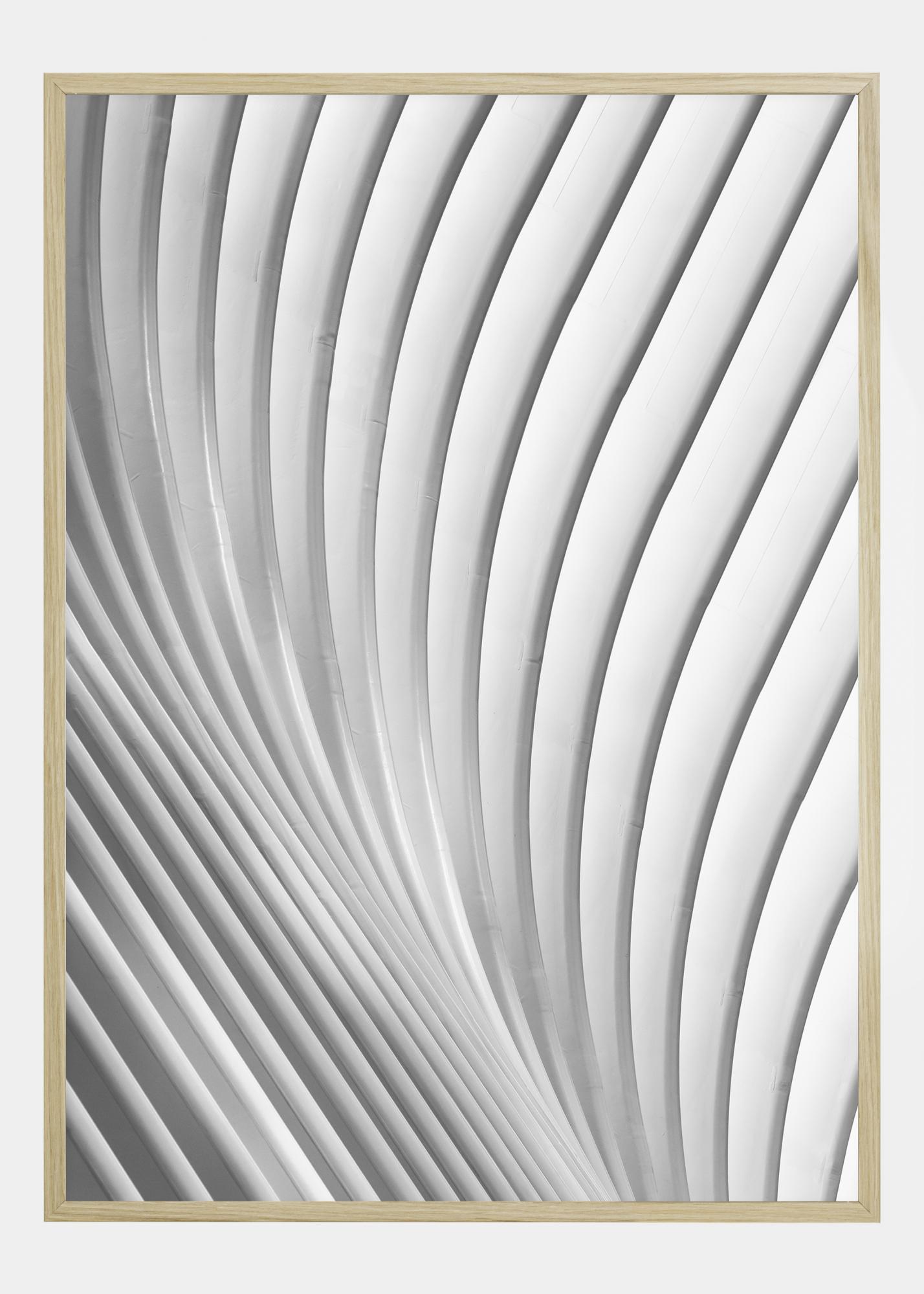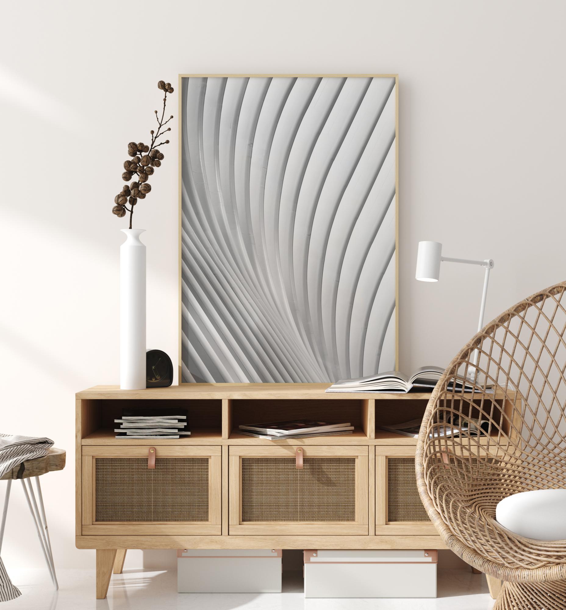 Abstrakcyjny plakat z falującymi białymi i szarymi liniami na zdjęciu. Linie zaczynają się na dole po prawej stronie i delikatnie wyginają się w górę, zanim skręcą w prawo. Choć jest prosty, ten obraz przyciąga uwagę, gdy pozwolisz swoim oczom się zrelaksować i podążasz za liniami.