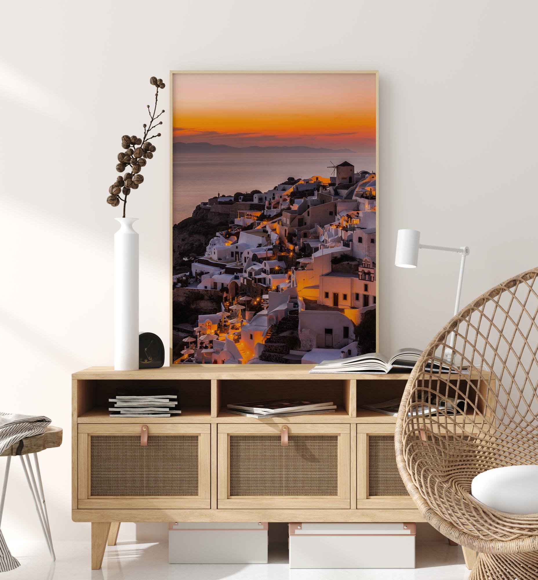 Sceniczny plakat z Calisera Santorini o zachodzie słońca. Małe miasteczko świeci delikatnie w świetle ulicznych lamp. Białe domy wyróżniają się na tle miękkiego, zamglonego morza i gór w tle z żywym niebem o zachodzie słońca. Podróżuj bez opuszczania domu, patrząc na ten plakat.